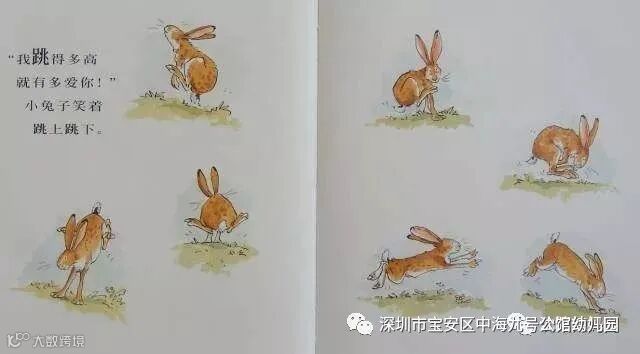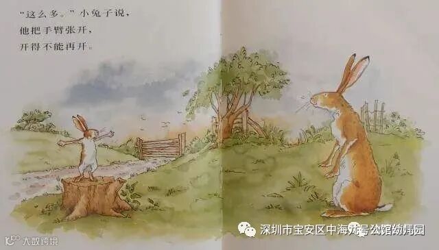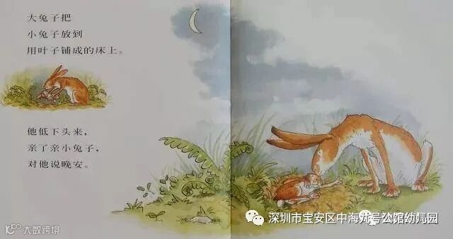 然后他躺在小兔子的身边,微笑着轻声地说:“我爱你一直到月亮那里,再从月亮上——回到这里来。