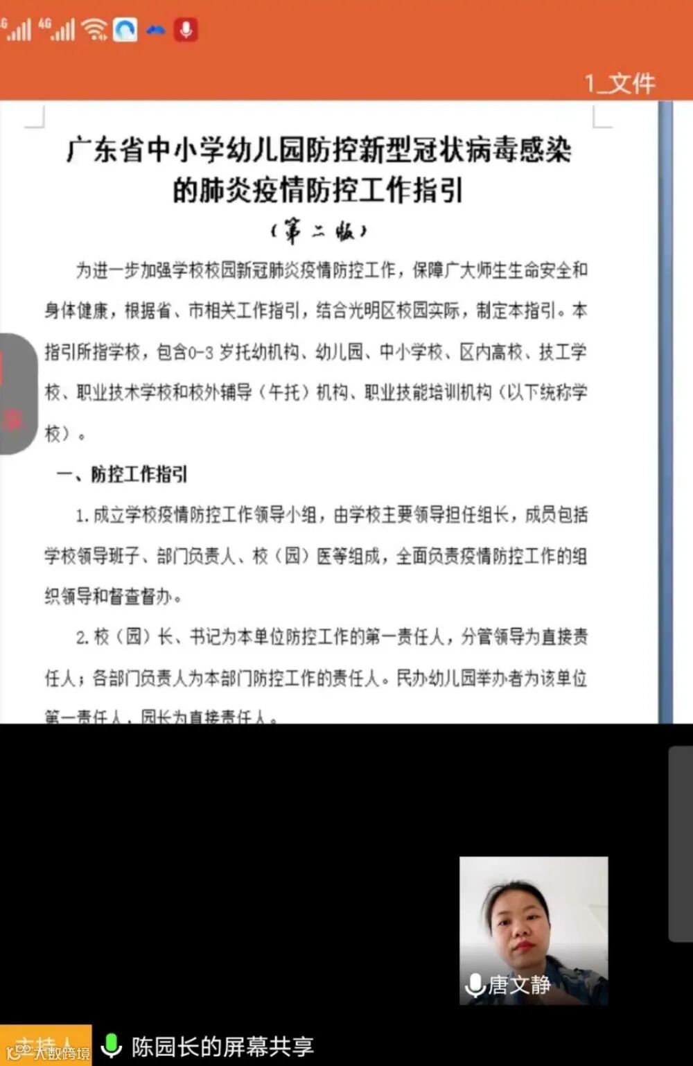 首先,陈园长带领大家认真仔细地学习了《广东省中小学幼儿园防控新 冠肺炎疫情工作指引》和《学校新冠肺炎疫情防控工作指引》。