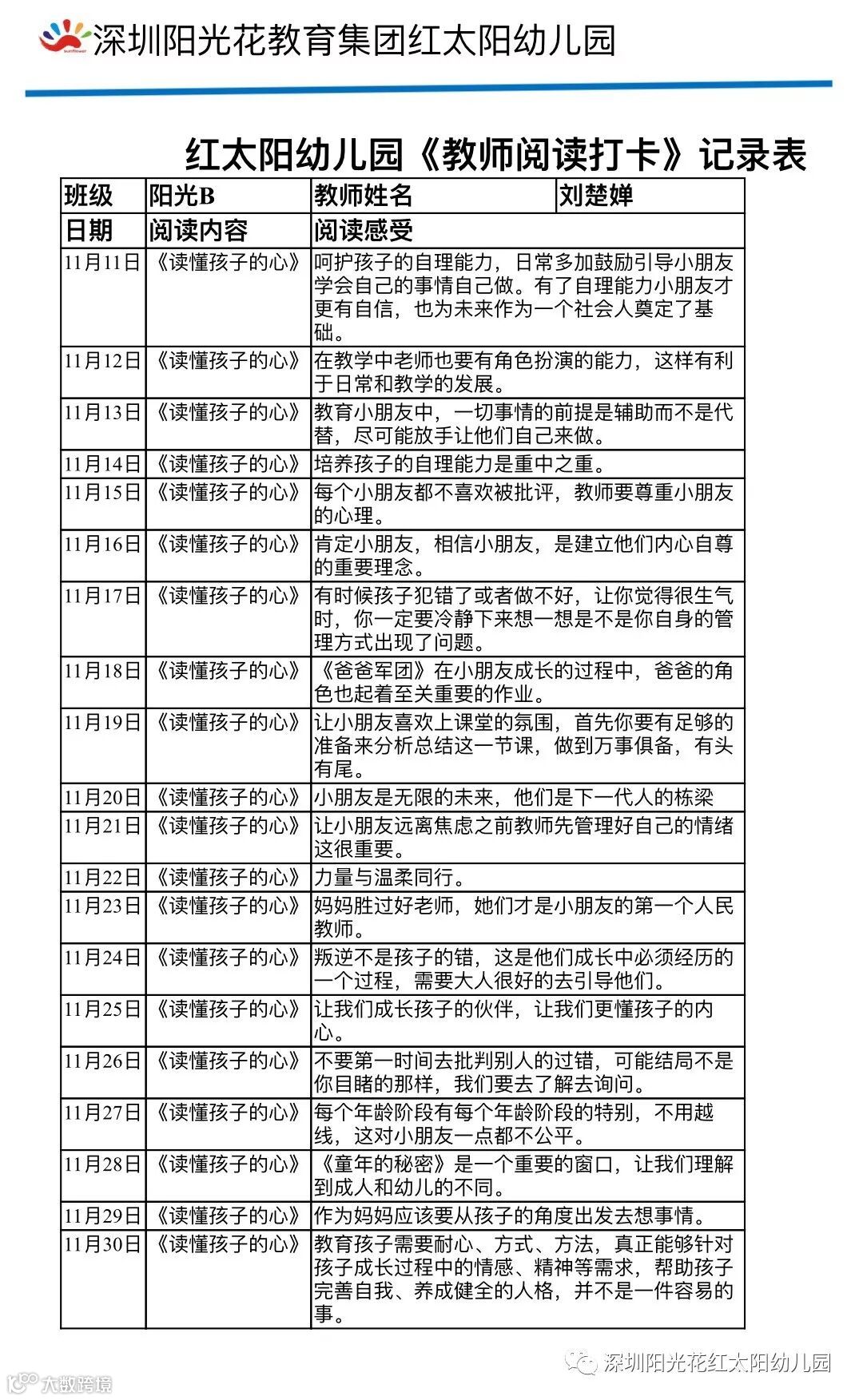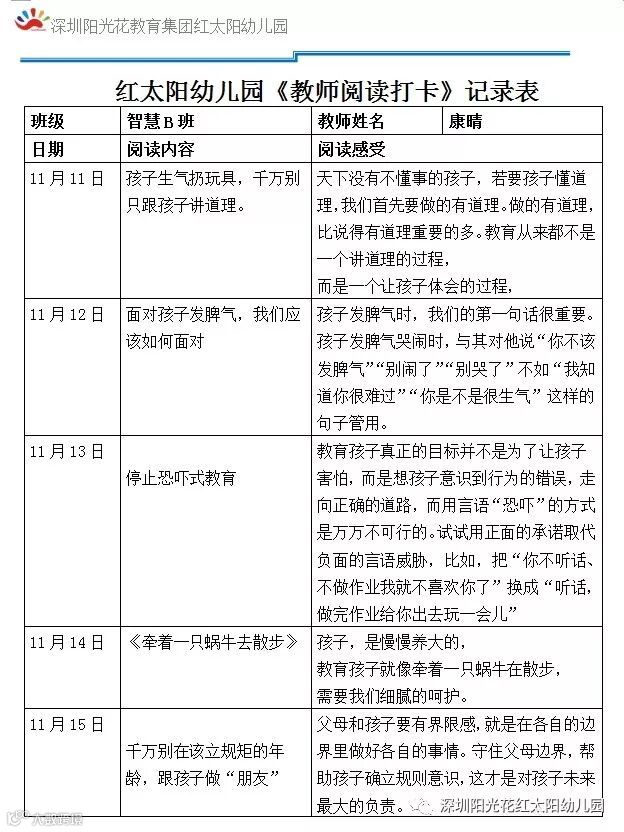 用新思想新理念指导与反思自己的教育教学行为,不断更新教育理念,提高教育教学创新能力和教育科研能力,以更加适应发展的需要。通过读书活动不断提升自己的文化内涵和修养,提高自己运用科学观点看待问题的能力。跟随阳光花素养课程《爱上阅读月》的开展,红太阳幼儿园全体教师从11月11日-12月11日利用休息时间自行进行阅读15-20分钟!提高自身学习的兴趣,让自己与好书作伴,与大师对话,在读书中成长。