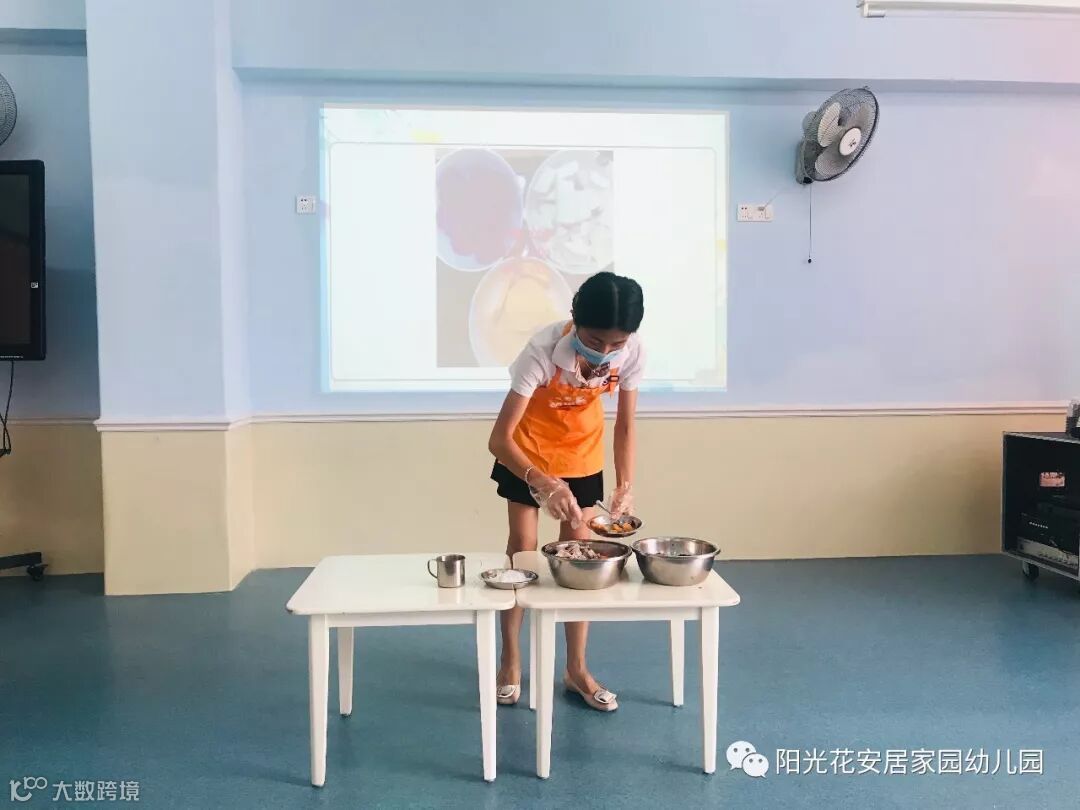 甜点怎么少得了水果呢!第二环节,潮宝们亲手将自己带来的水果切成丁,放进自己的小碗中。