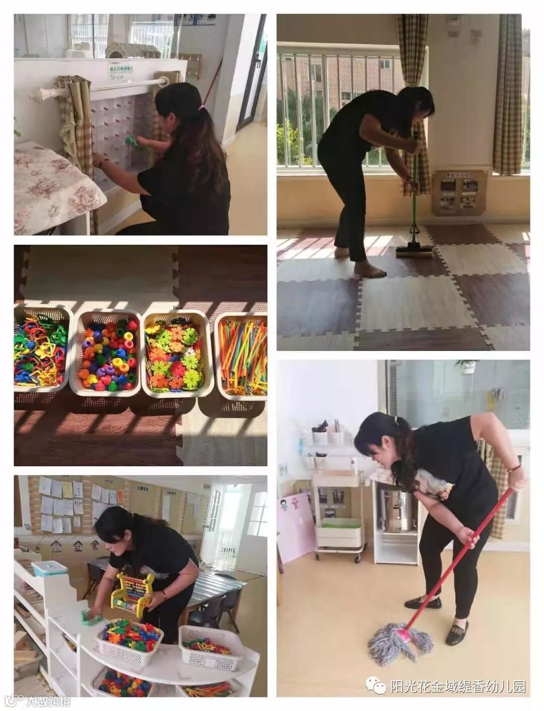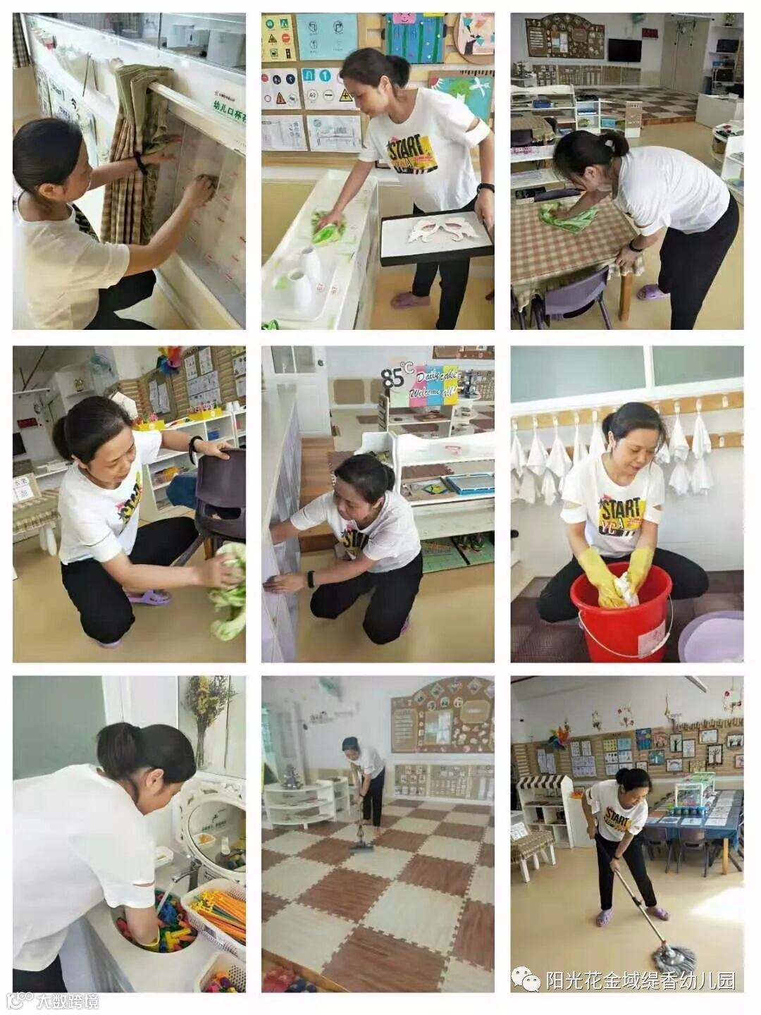 各位老师扫的扫、抹的抹、擦的擦、洗的洗、冲的冲,干劲非常足,大家对幼儿园各个角落仔细排查、认真打扫,做到不留盲区。经过一天的“奋战”,幼儿园焕然一新,呈现出一片整洁亮丽、活泼清新的新气象。