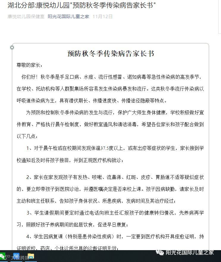 幼儿园定期利用多形式开展家园共育,家校联合做好预防传染病的宣传工作,保障幼儿的健康。