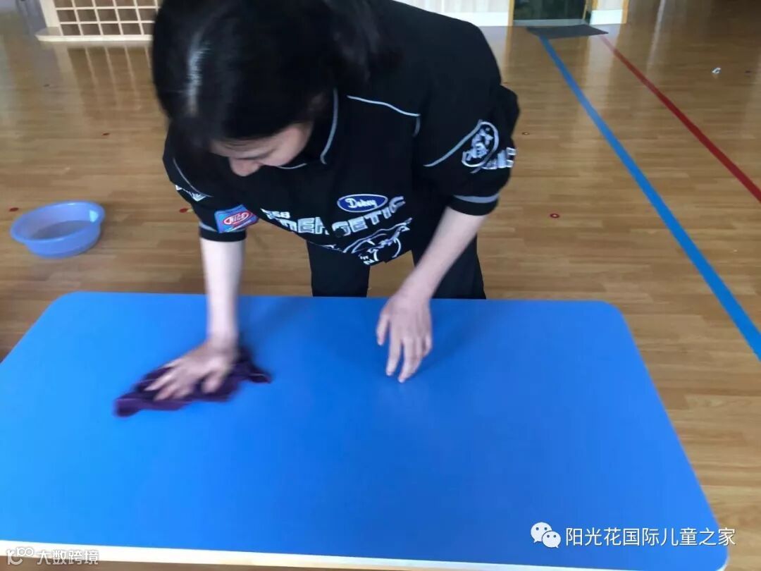 幼儿园所有的公共环境及物表每日均在早会前(7点前)完成消毒工作。日复一日的坚持只为带给孩子营造健康、卫生的校园环境。