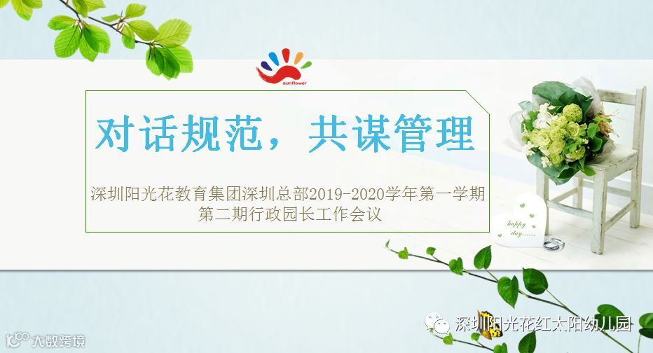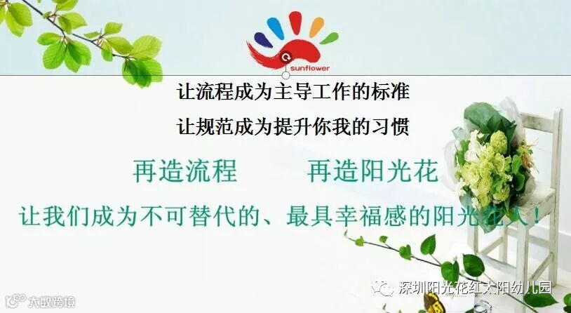 让流程成为主导工作的标准,让规范成为提升你我的习惯。阳光花20年后的今天,我们再造流程,再造阳光花,让我们成为不可替代的、最具幸福感的阳光花人。夯实基础,规范管理,提升内涵,铸就品质,在规范中求稳定,在稳定中求发展,在发展中求特色,让每个阳光花人在幼教道路上真正站得稳,站得高,走得远,走得更强大。