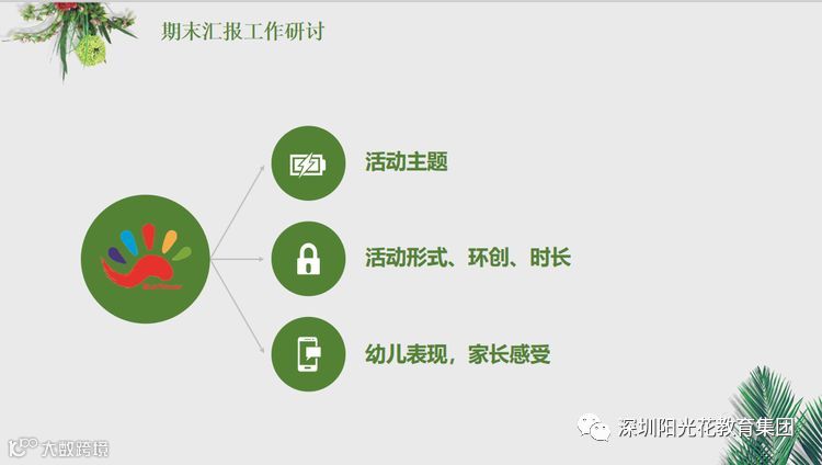 期末汇报是阳光花幼儿园的特色活动之一,深受家长的认可和喜欢,它代表着幼儿在园一个学期的教学成果展示,办好本学期的汇报活动也是教研工作的重点,金总监提出,本次活动要成为展示孩子的舞台,让家长和孩子共同拥有仪式感、拥有参与感、拥有成就感。