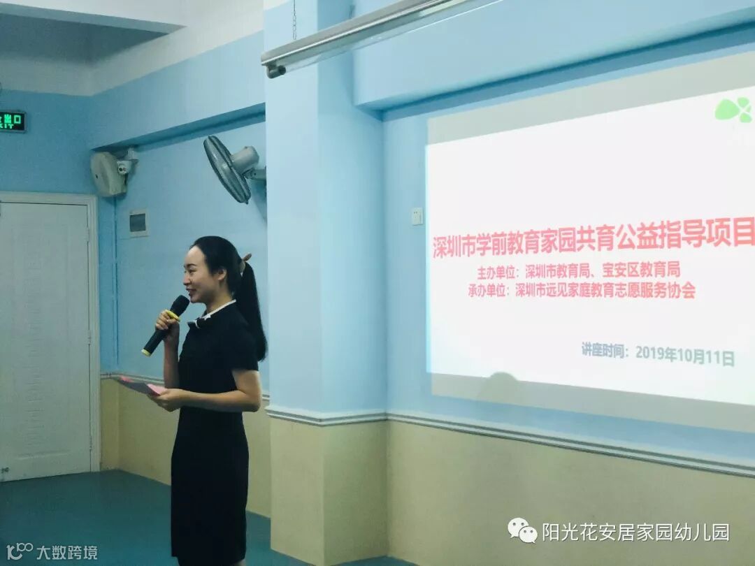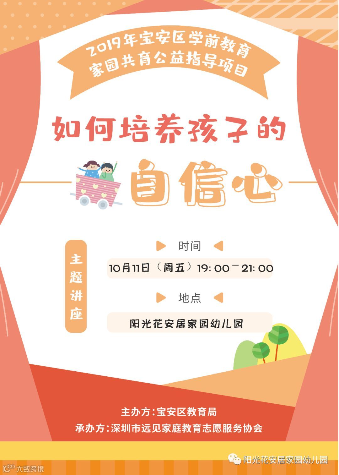 为了帮助家长获取更多优质的家庭教育知识,提升家庭幸福感,助力孩子们的健康成长,2019年10月11日晚,阳光花安居家园幼儿园中大班的家长齐聚幼儿园三楼音体室,共同学习由宝安区教育局主办的家园共育公益讲座《如何培养幼儿自信心》专题活动。