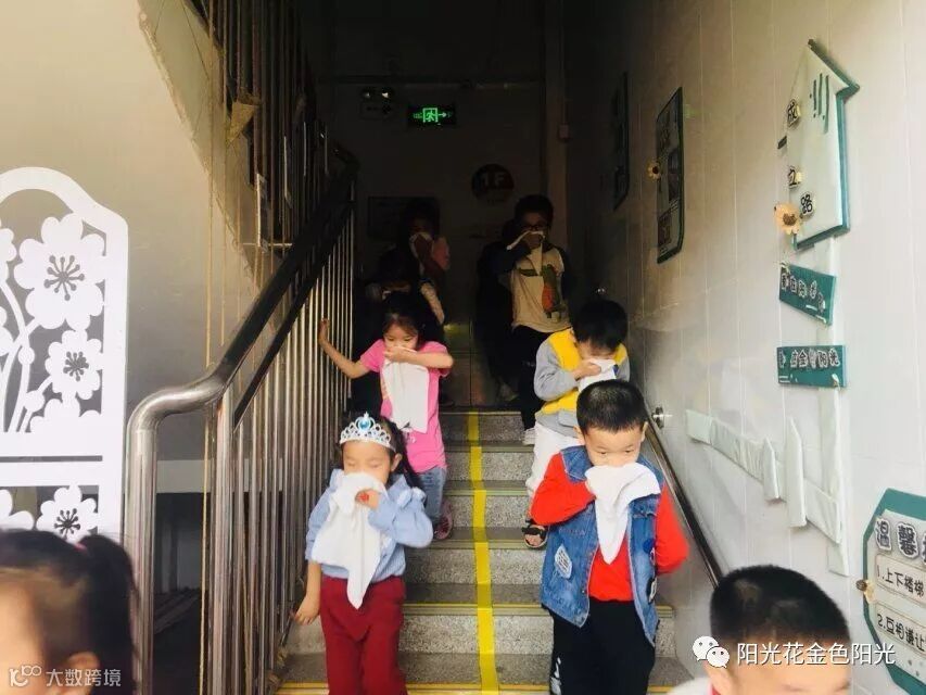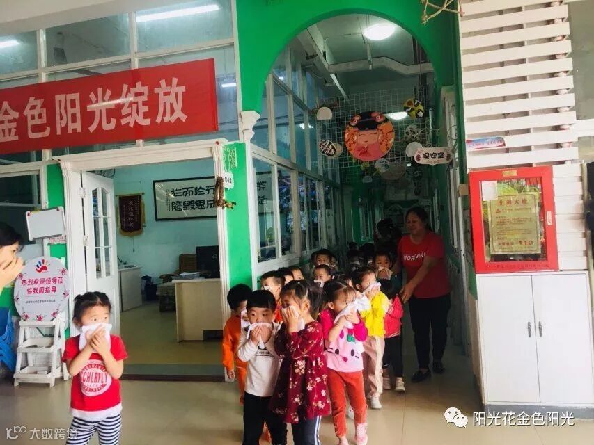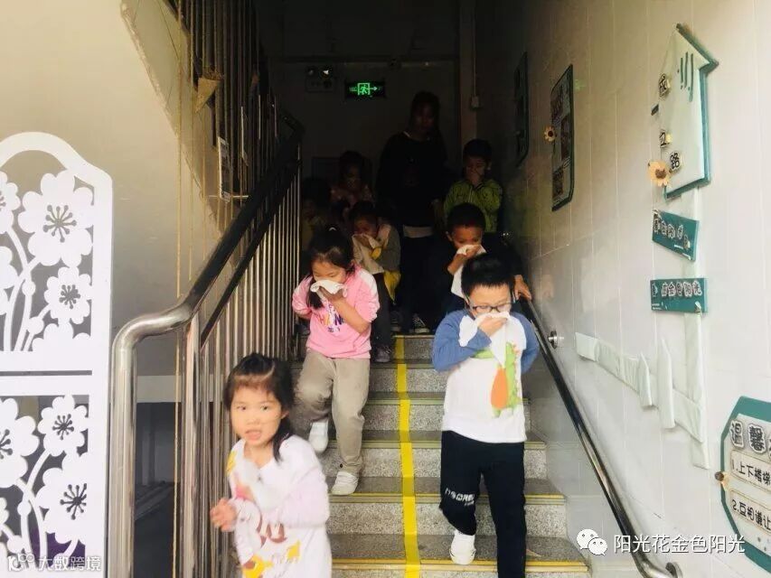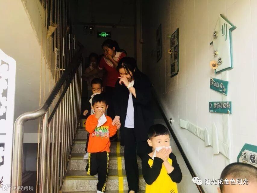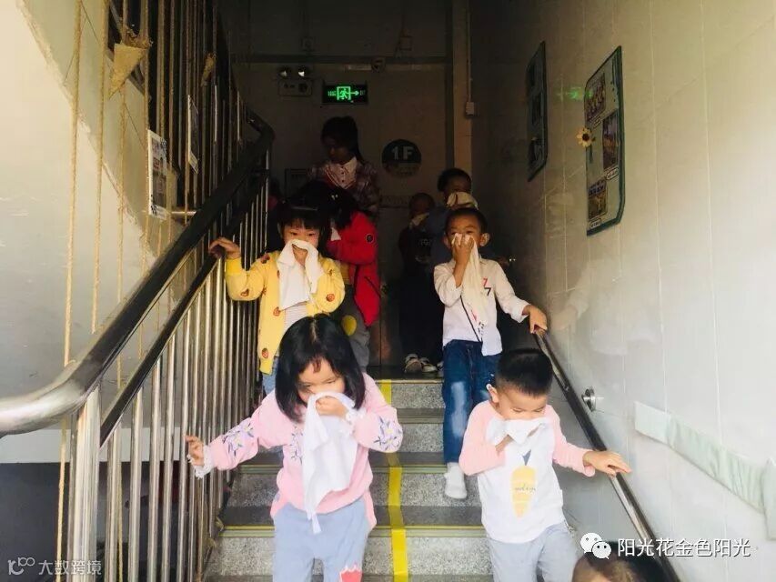 幼儿园使用烟雾弹来模拟起火情景。保安人员发现火情,报告幼儿园安全负责人。随着警报声的响起和仿真烟雾弹的喷发,消防疏散演练活动开始了。孩子们在老师的带领下,用手帕捂住鼻子按照消防逃生路线安全疏散,迅速地跑到大厅。