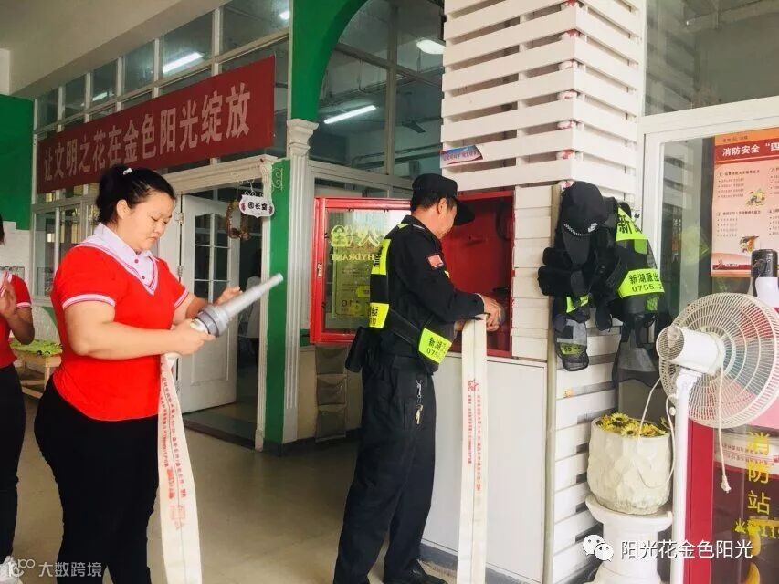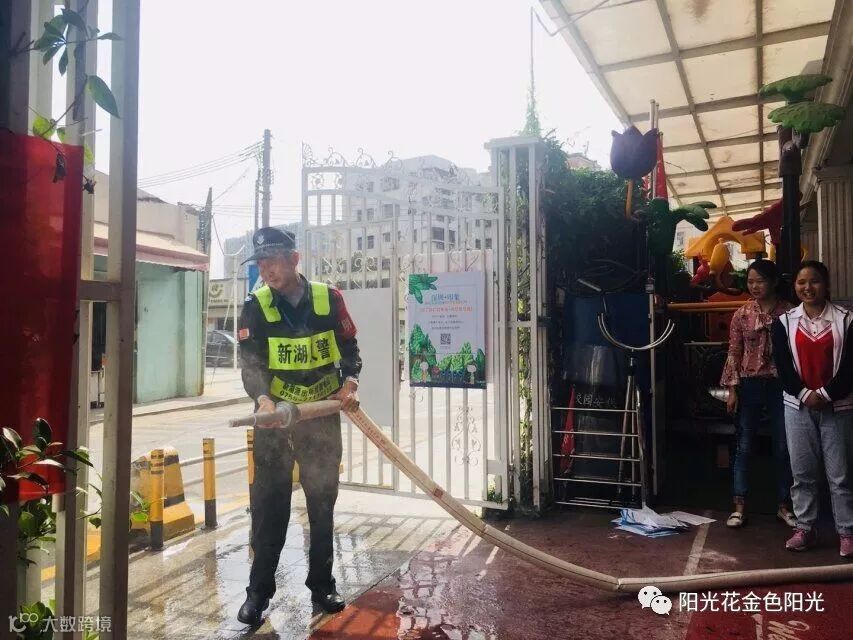 老师们认真现场学习消防栓使用方法,为了使我们能够正确使用消防栓,保安叔叔现场为我们示范,用消防栓将火熄灭。