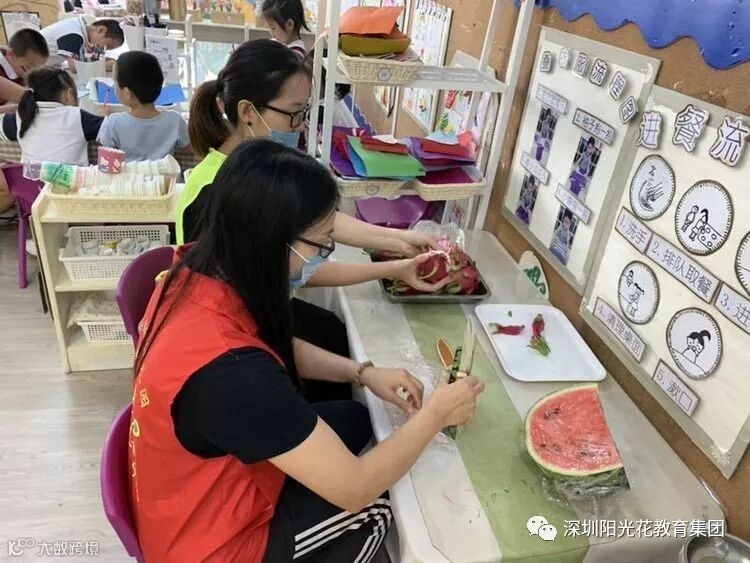 水果餐时间到了,家长和老师们一起为孩子切水果,小朋友吃水果都是用夹子夹到碟子里吃的,这样既做到了干净、卫生,促进幼儿自主服务的意识及动手能力的培养。