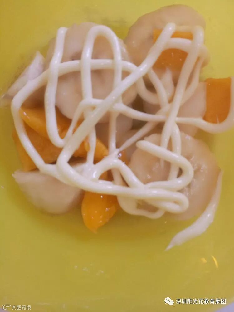 宝贝们都动起小手,给水果加上沙拉酱,最后在宝贝们的努力下,成功做出了可口的水果沙拉。