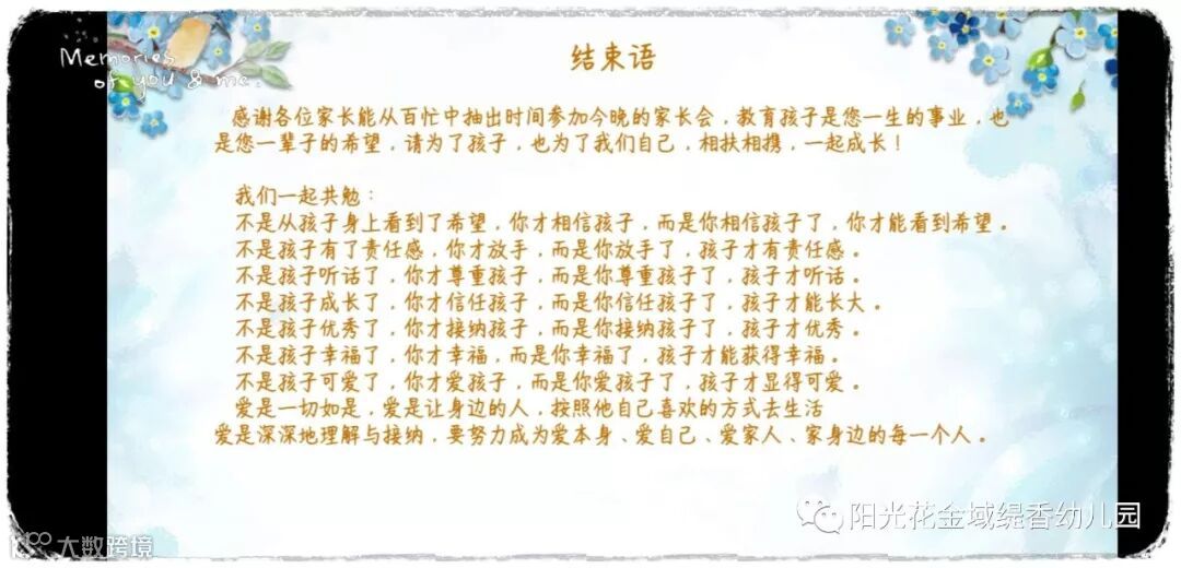 感谢家长朋友们能在百忙中抽出时间参加今晚的家长会,相信大家今天都收获满满,教育孩子是您一生的事业,也是您一辈子的希望,请为了孩子,也为了我们自己,相扶相携,一起成长!