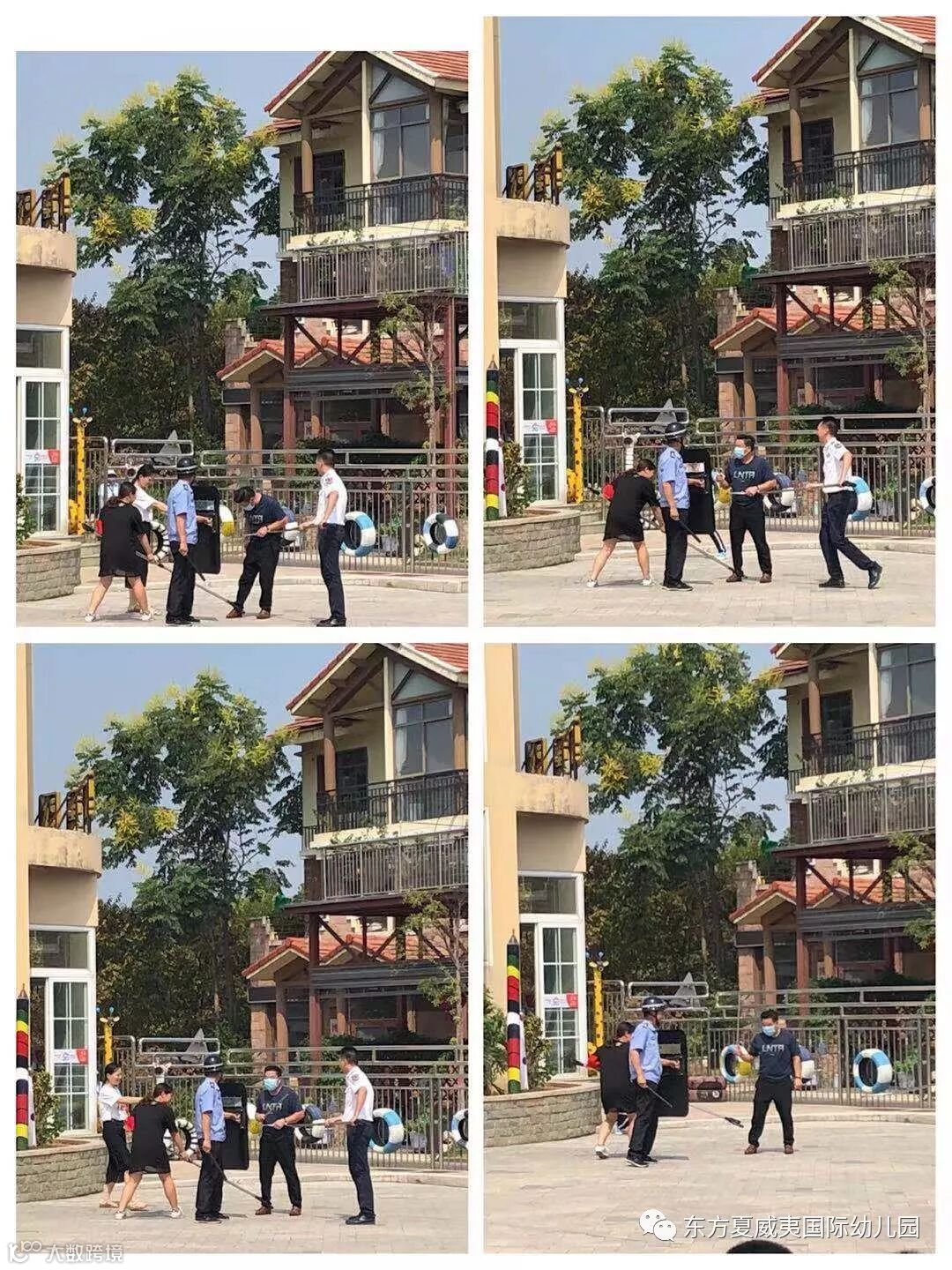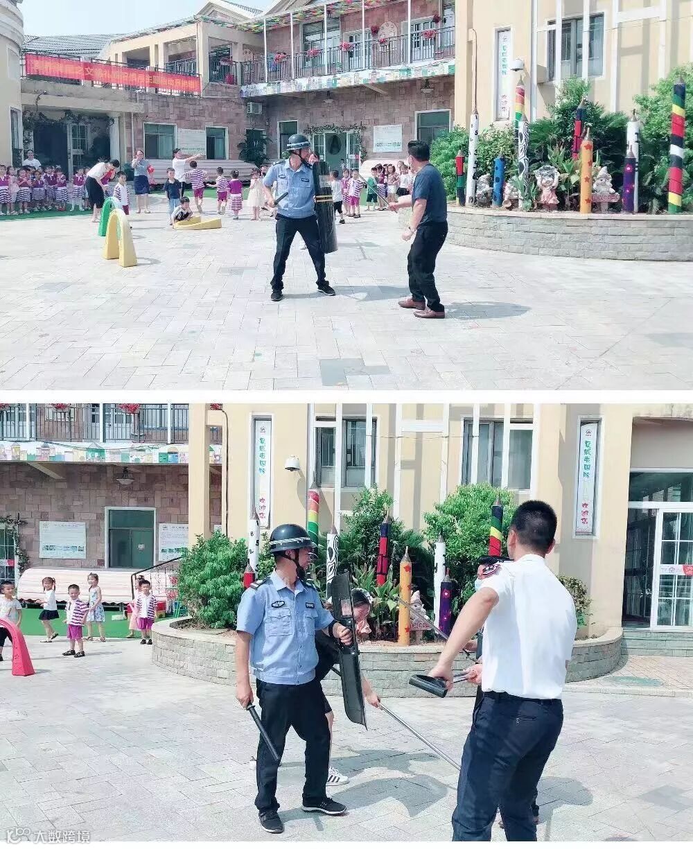 为进一步提高我园处理突发事件的应急能力,进一步加强我园防恐防暴工作,在结束消防演习后,孩子和老师处于放松状态的情况下,一名友情扮演的“歹徒”来到了幼儿园,想要强行闯入幼儿园内“伤害”园内人员,保安发现后迅速做出紧急应急措施,护校队人员也都纷纷迅速组织园内师生,迅速采取预案措施,疏散操场上的幼儿进入室内进行躲避,保护幼儿安全。
