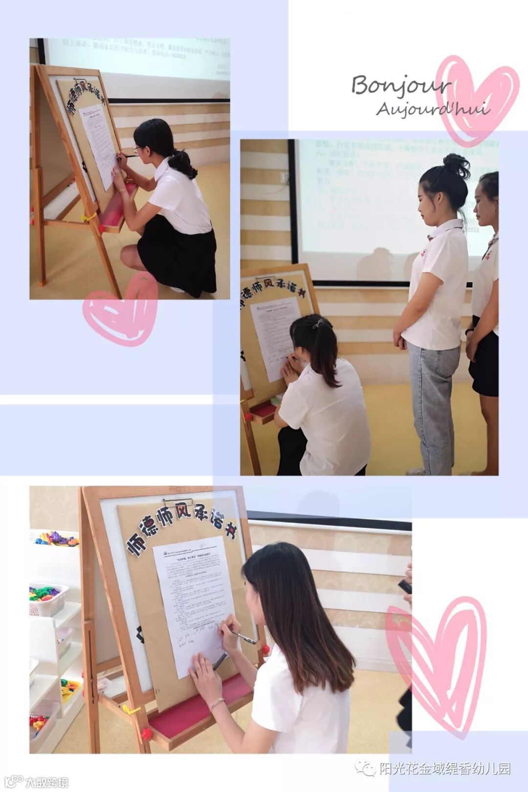 修师德,塑师风。我承诺,敬业爱岗、遵纪守法、热爱幼儿、严谨治学、团结协作、廉洁从教、为人师表,做一个阳光的教育者。