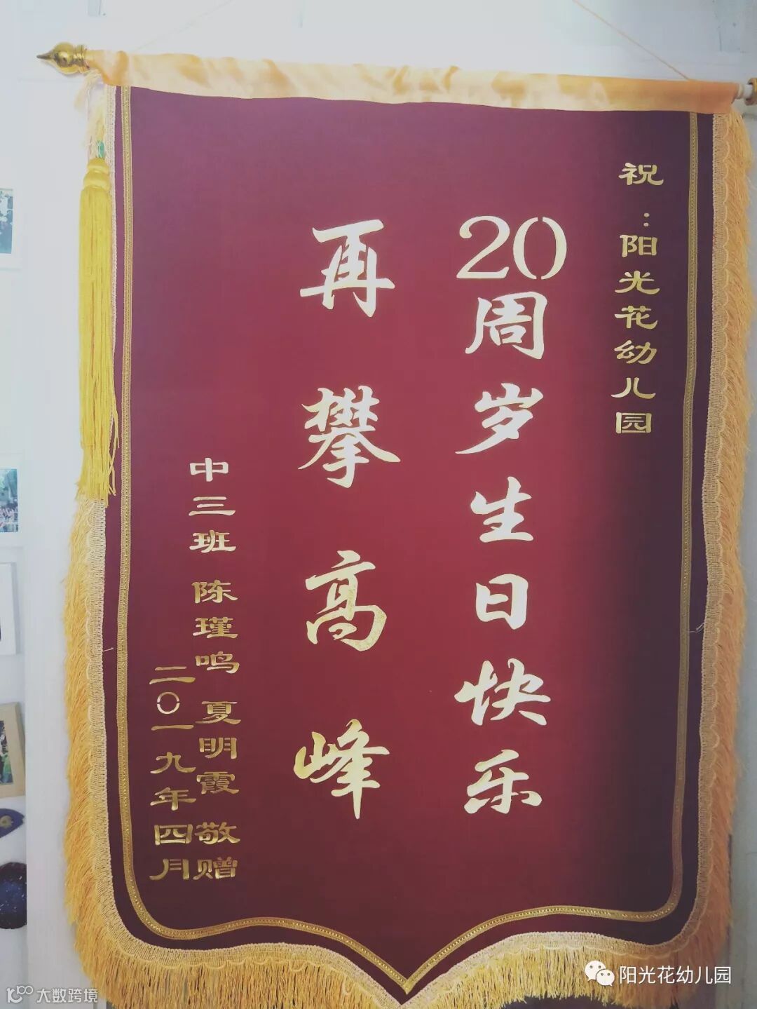 最后还要特别感谢中三班陈谨鸣妈妈,夏明霞妈妈为阳光花二十周岁生日送来的一面锦旗。您们的支持,将是我们前进路上最大的动力。