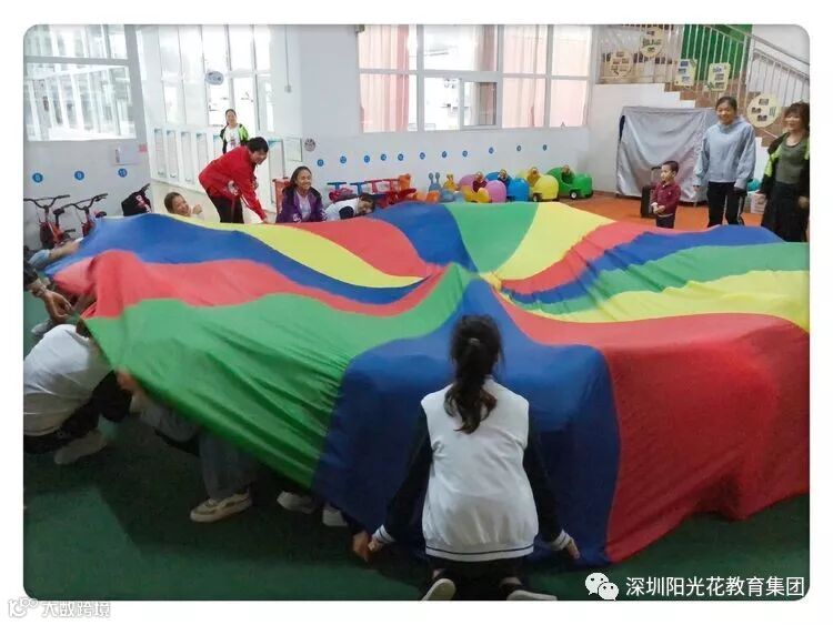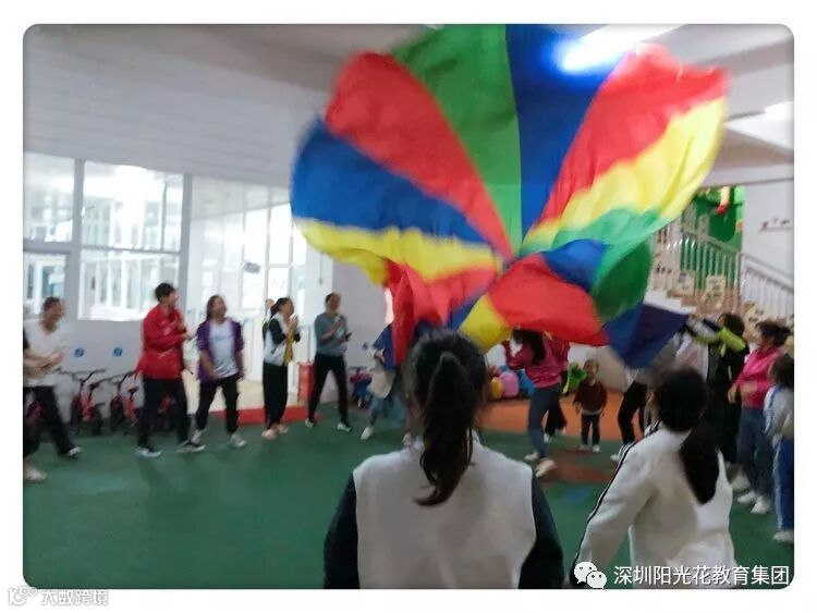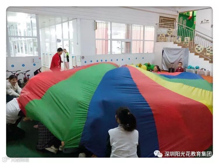 “彩虹伞”不仅给幼儿带来了游戏上的很大乐趣,更促进了幼儿身体协调的发展,彩虹伞玩法多样,也是集体游戏很好的教具,还能促进同伴之间的合作能力,本次教研活动主题“遇见彩虹伞”。