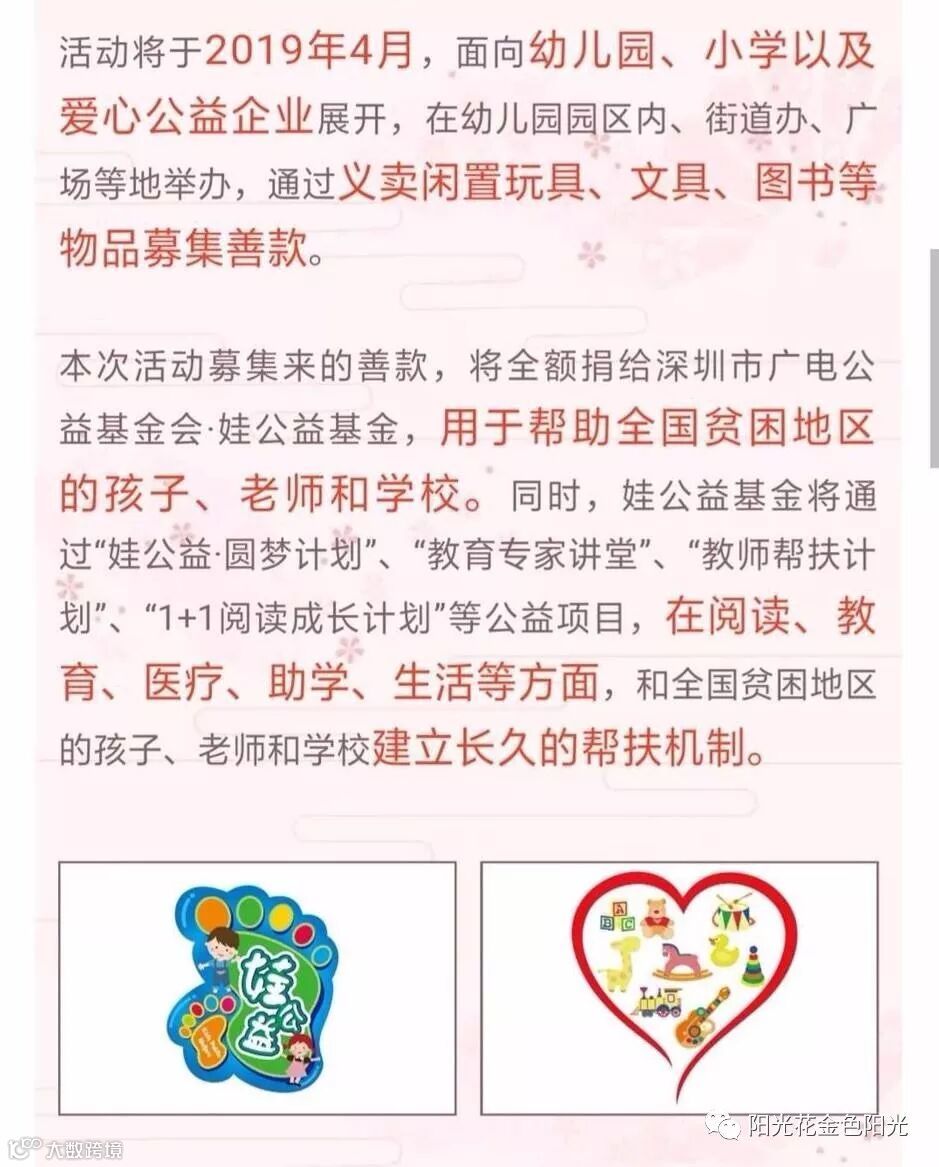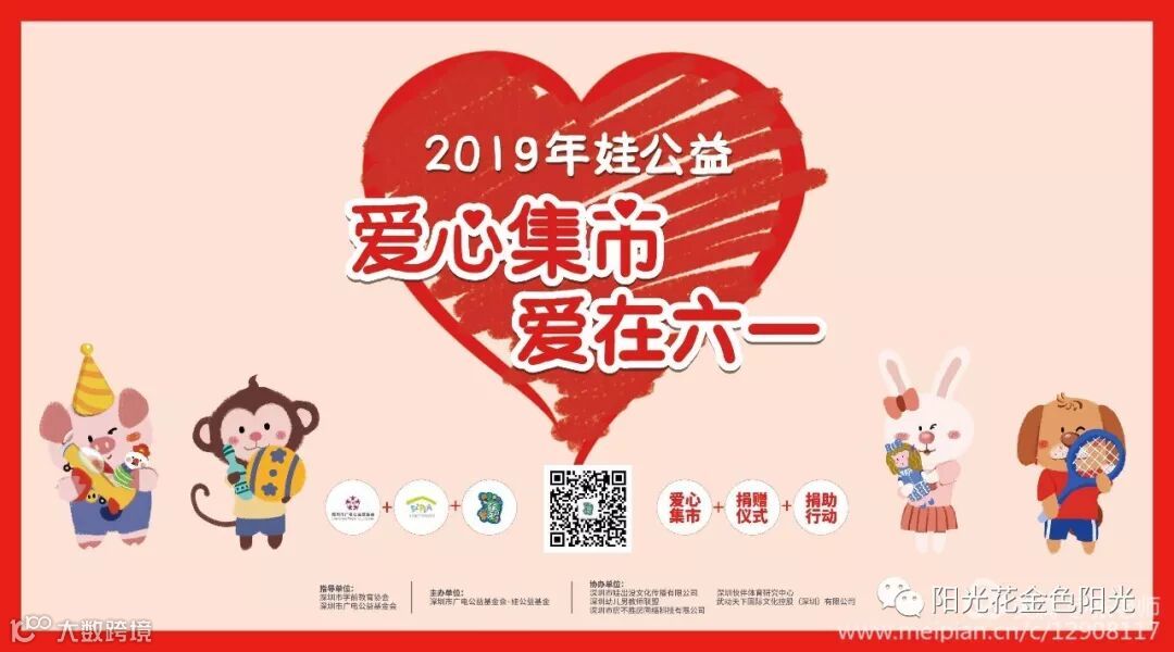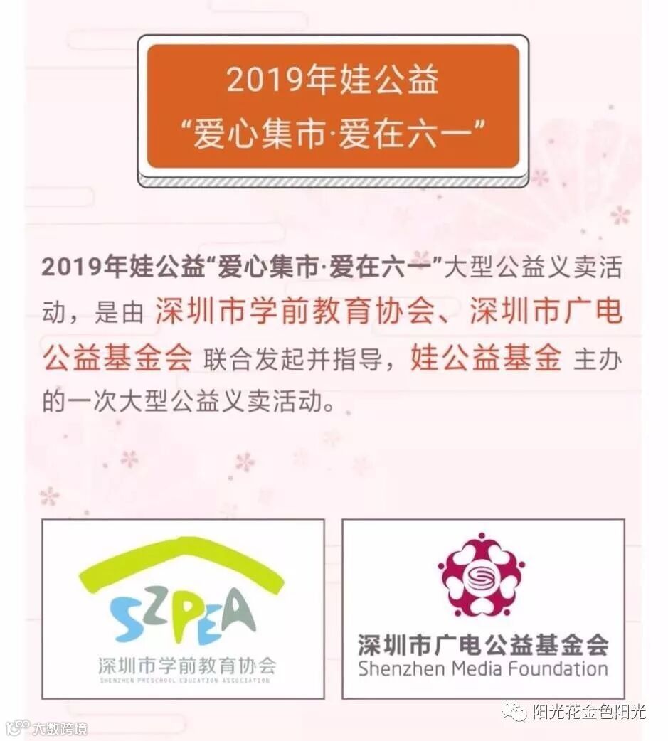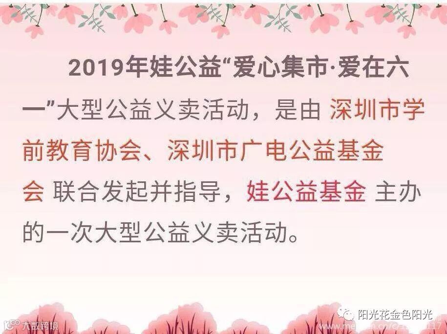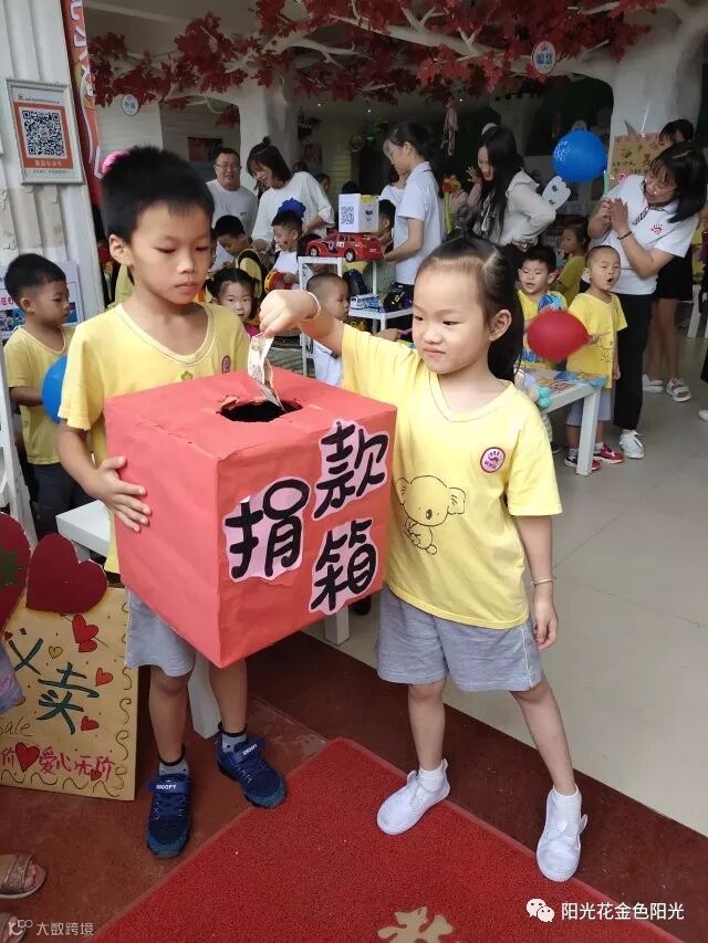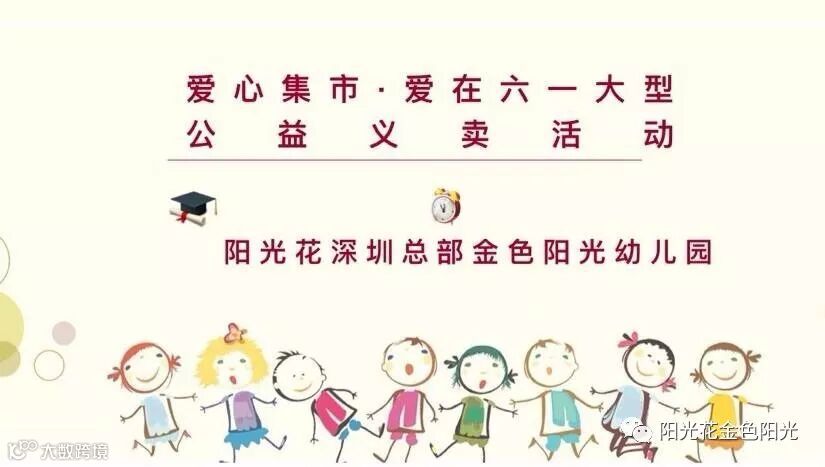 “六一”国际儿童节,在这个充满爱的季节里,孩子们都沉浸在节日欢乐的海洋中,享受着爱的滋润,无比幸福!但是也有些孩子可能贫困、疾病不能享受节日的快乐。为了让我们的孩子在被爱的中学会付出爱,培养他们关心弱者、乐于助人的优良品质,在她们稚嫩的心田下播下人文关怀的种子。阳光花-深圳市光明区新湖金色阳光幼儿园2019年娃义卖“爱心集市•爱在六一”大型公益义卖活动于5月28日-29日拉开序幕!