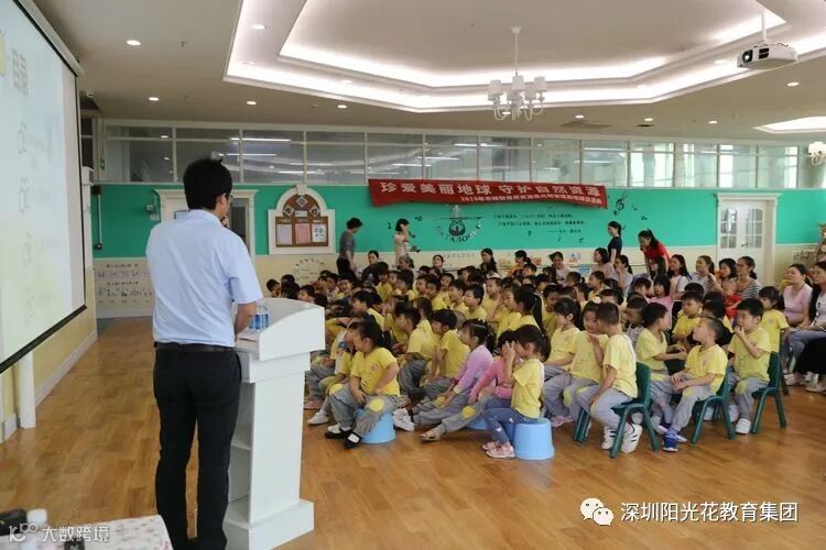 召开 “珍爱美丽地球 守护自然资源”的科普报告会,讲座完成时,幼儿和家长一起观看自然资源保护片。
