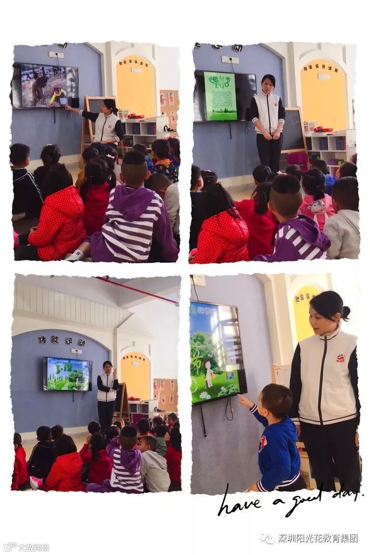 活动一:绿化孕育了文明,关心爱护绿色生命,保护身边的绿化成果,是我们每一个公民应尽的义务和不可推卸的责任,为了让宝贝们充分了解树木的知识,老师们早上晨谈活动利用多媒体给宝贝们讲解了植树节的来历极其远大意义,进一步了解树木与人类的密切关系,提高孩子保护树木花草的责任感,增强爱护树木的能力。