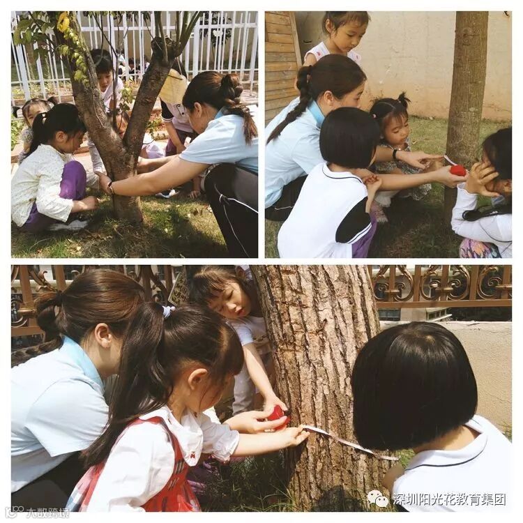 老师还带领着小朋友一起去给树量腰围。