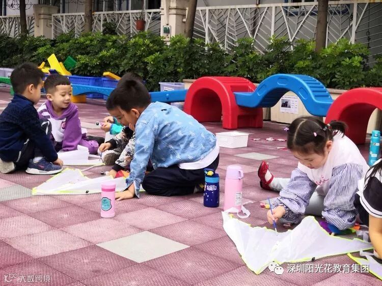 在老师把风筝拿出后,小朋友们就已经迫不及待想要在风筝上留下自己的创作了。