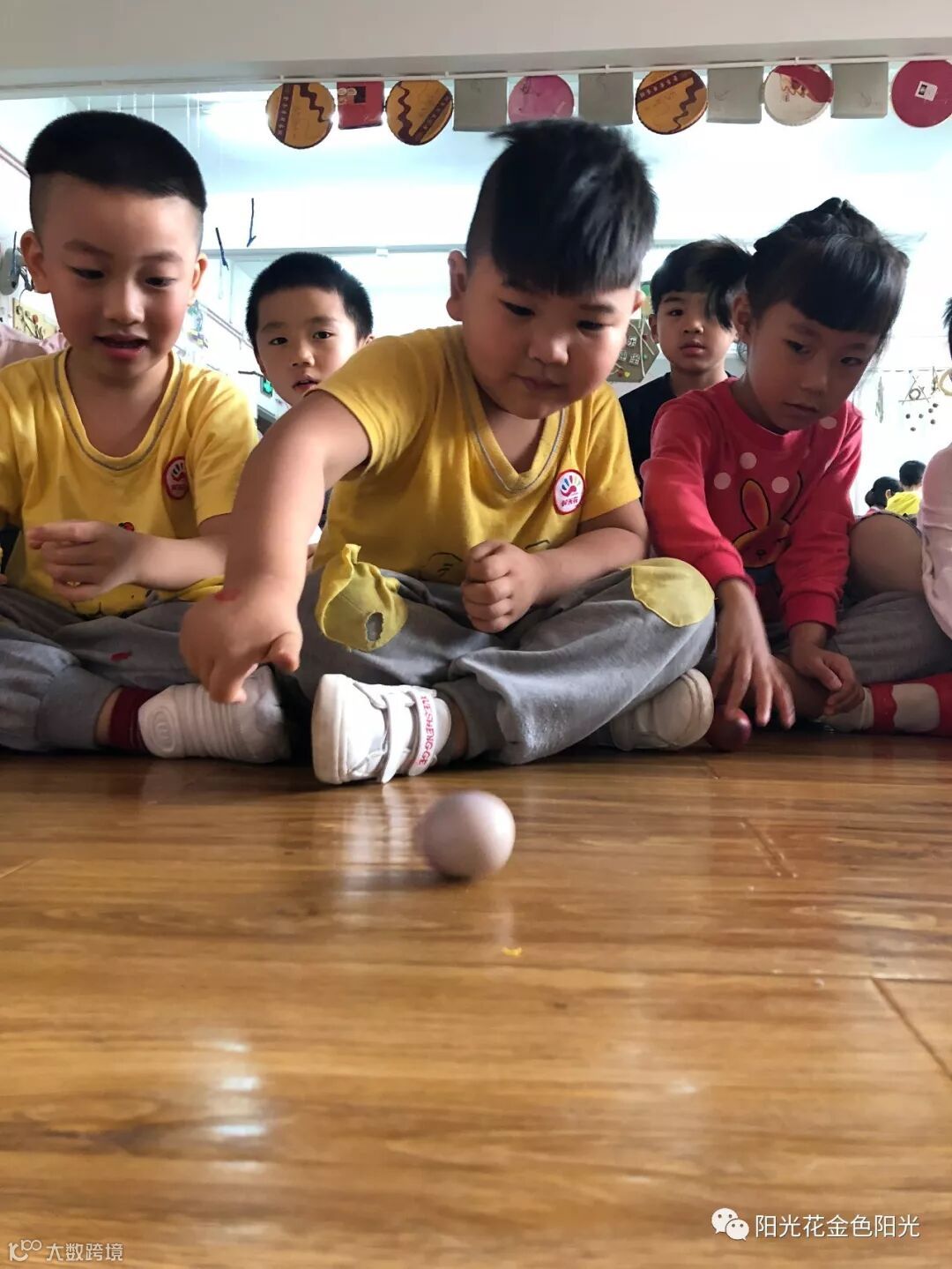 玩鸡蛋:小朋友们发挥想象力用鸡蛋做出多种玩法(滚、转、抛、立、碰鸡蛋等),比赛看谁的玩法多。