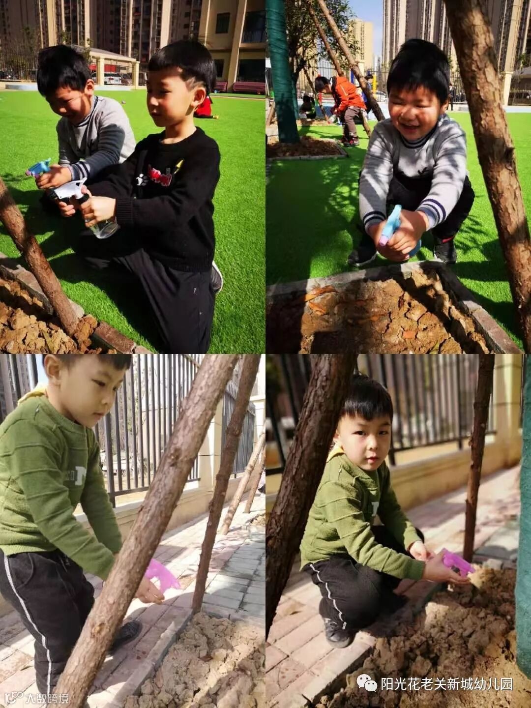 “小树,小树,我要给你最好的养分!”宝贝们都拿起水壶给小树浇水啦!