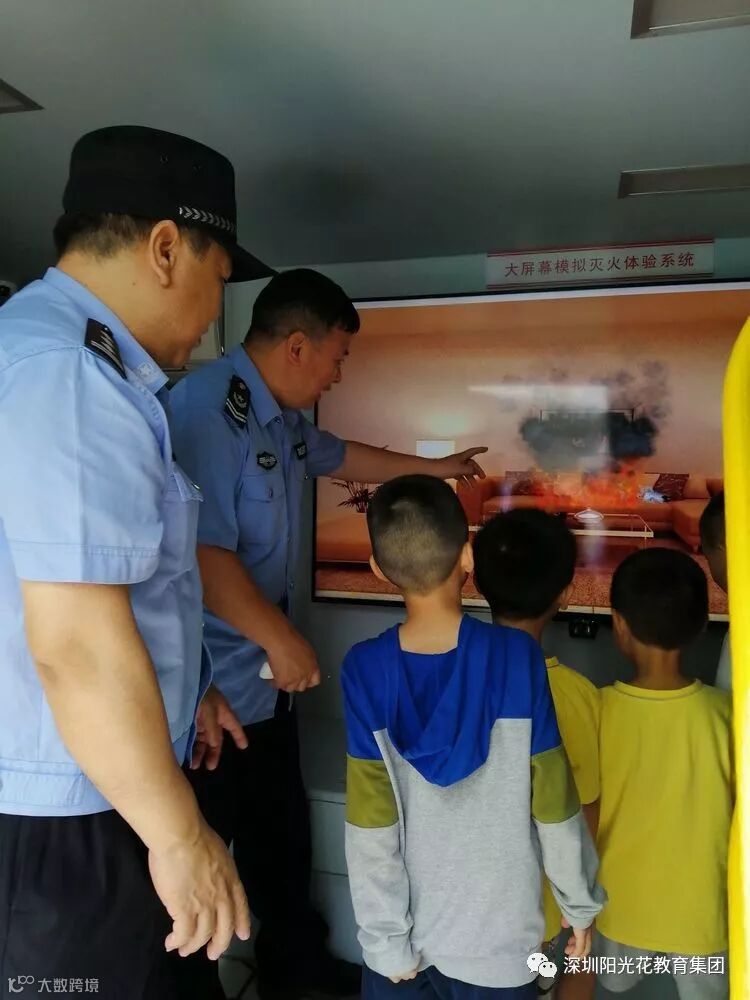 接着,小朋友们轮流上消防宣传车进行演练。看,敬爱的警察叔叔已经整装待备,洪主任开始了消防器材知识宣讲!