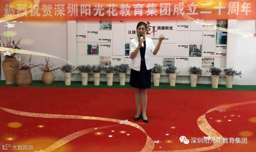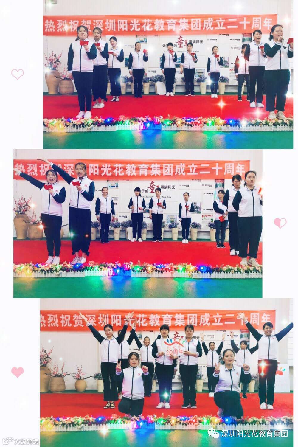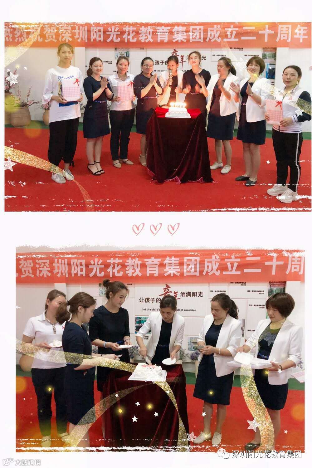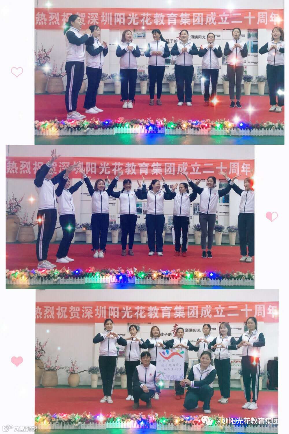 二十年的风霜风雪,二十年的坎坷历程,二十年的上下求索,二十年的同舟共济。我们迎来了深圳阳光花教育集团二十华诞。 二十年的道路不平坦,我们阳光花人风雨同舟,创下硕果累累,赢得鲜花遍地开。我们的努力创造了辉煌的过去,我们的畅想预示了灿烂的未来。祝阳光花教育集团越办越辉煌,桃李满天下。阳光花开,幸福满怀。