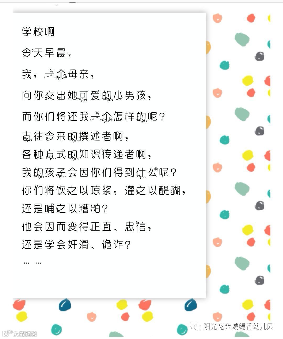 这是一段散文诗,字里行间中透出了母亲对孩子的爱,对社会的嘱托,更有对教育工作者的信任和期待。