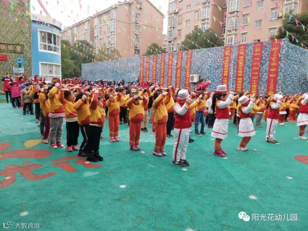 在欢乐愉悦的氛围中, 新鑫佳苑幼儿园全体师生一起唱跳阳光花园歌《幸福快乐阳光花》。