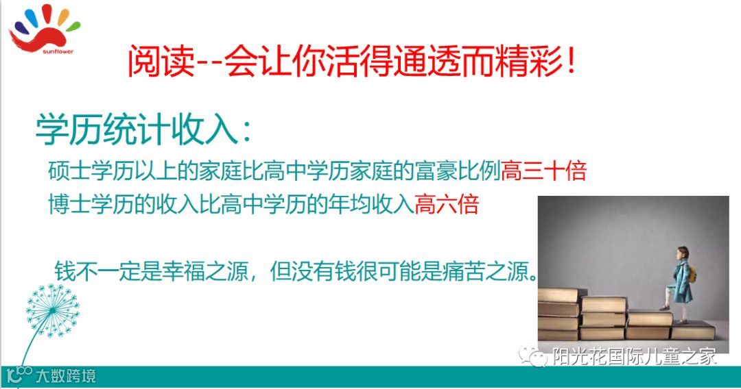 走进阳光花,开启阅读之门!本次家教报告王英女士分享了:我们为什么要阅读和父母陪伴孩子阅读的方法及在陪伴中阅读对父母、对孩子的人生所产生的影响!能够阅读的孩子,是能够学习的孩子。而能够学习的孩子,终将会在生活中获得成功!