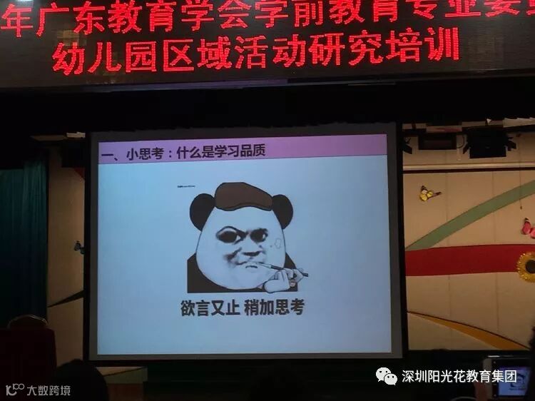 “什么是学习品质”?一开始,凌园长就抛砖引玉,提出问题,台下的园长老师们也不错,积极回应互动!从学习品质的结构、内涵、影响要素以及学习品质的具体表现;凌园长重点就“如何培养儿童的学习品质”进行了阐述,有效的学习要求调动积极的情感和动机,也要求有主动的参与和行为!分享结尾中,会场回荡起熟悉的旋律,凌园长用一首《心太软》改编版,告诉老师,要从孩子的点出发,观察孩子、读懂孩子,给孩子自主选择的权力!