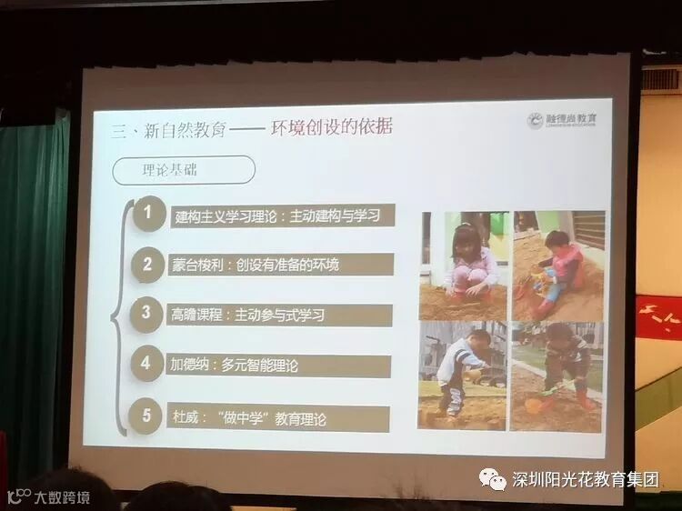 赖慧婷园长分享了新自然教育的课程理念以及其三大特色课程,在环境创设的理论基础上,为我们分享了关于蒙台梭利:创设有准备的环境、陶行知:生活即教育等理论;重点阐述了有效的三个学习因素及支架性区域环境的实施,同时提出:让教育回归自然,激发幼儿自主学习的内驱力,让幼儿在体验中生长!