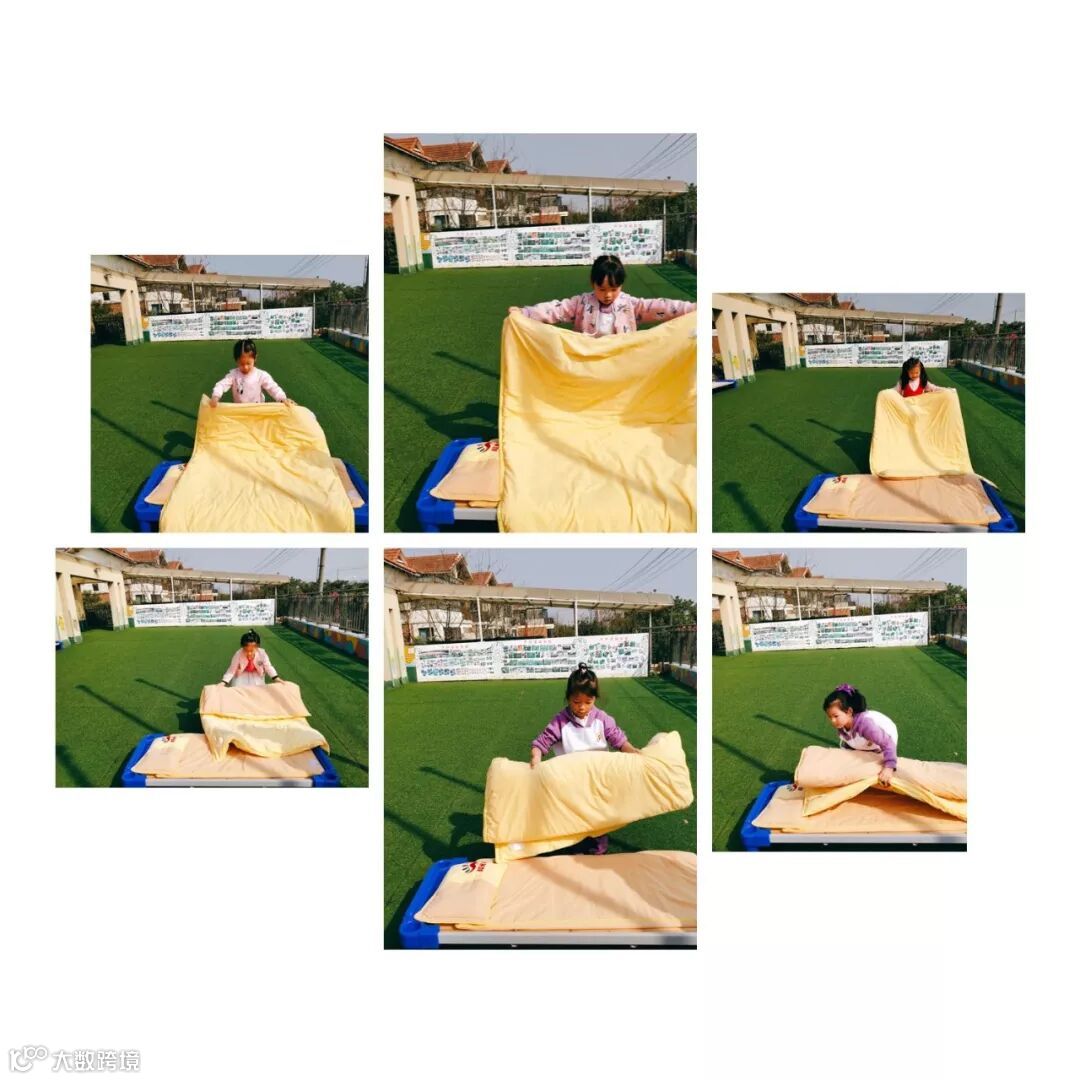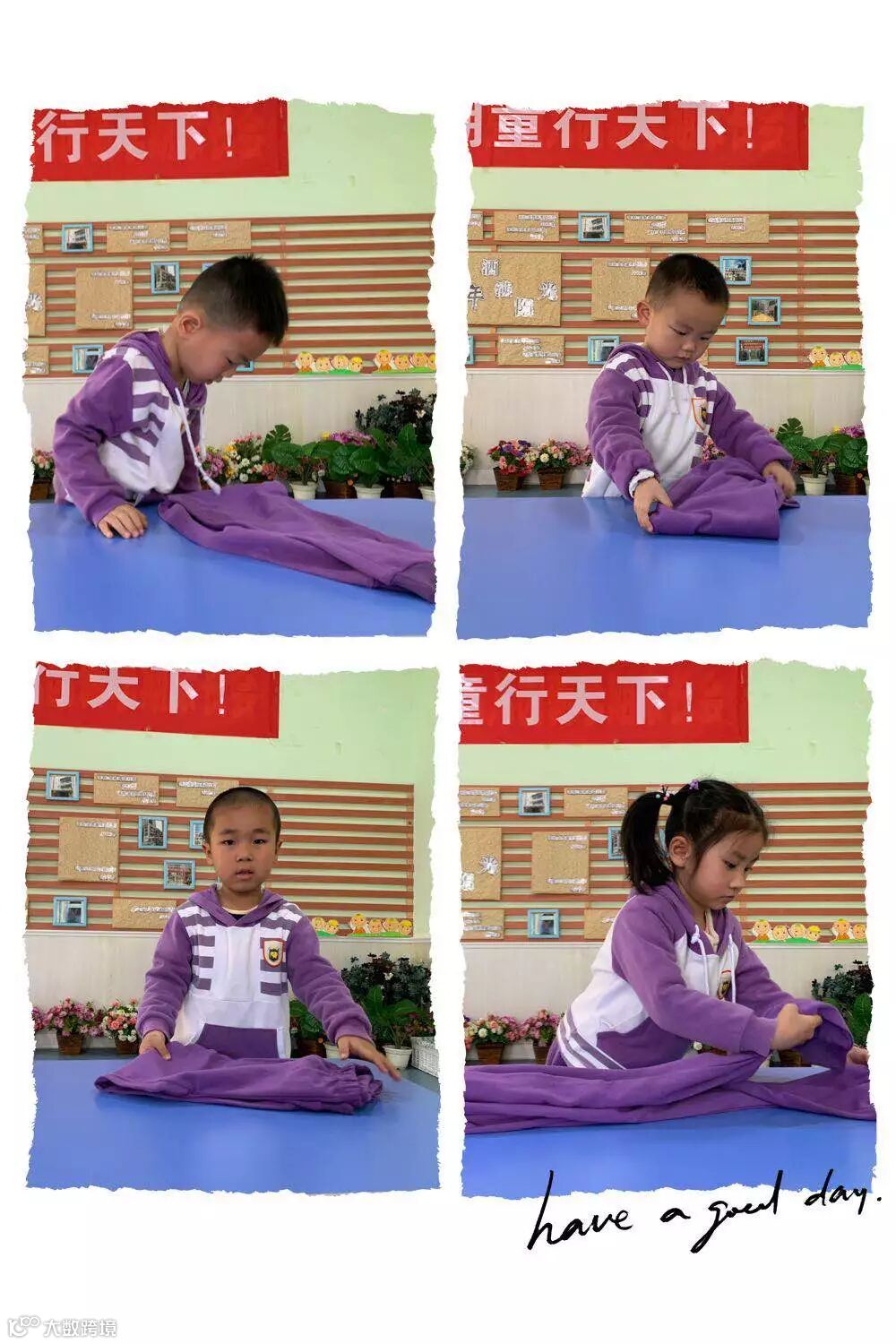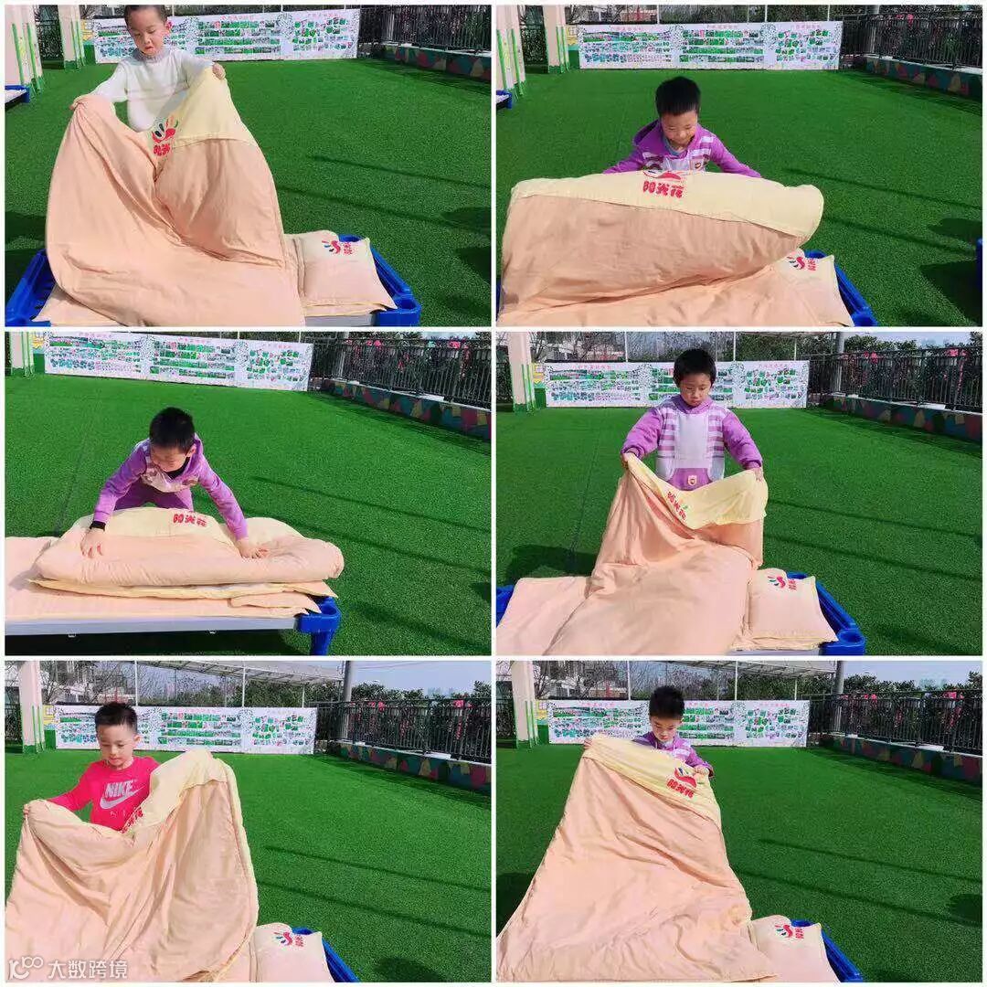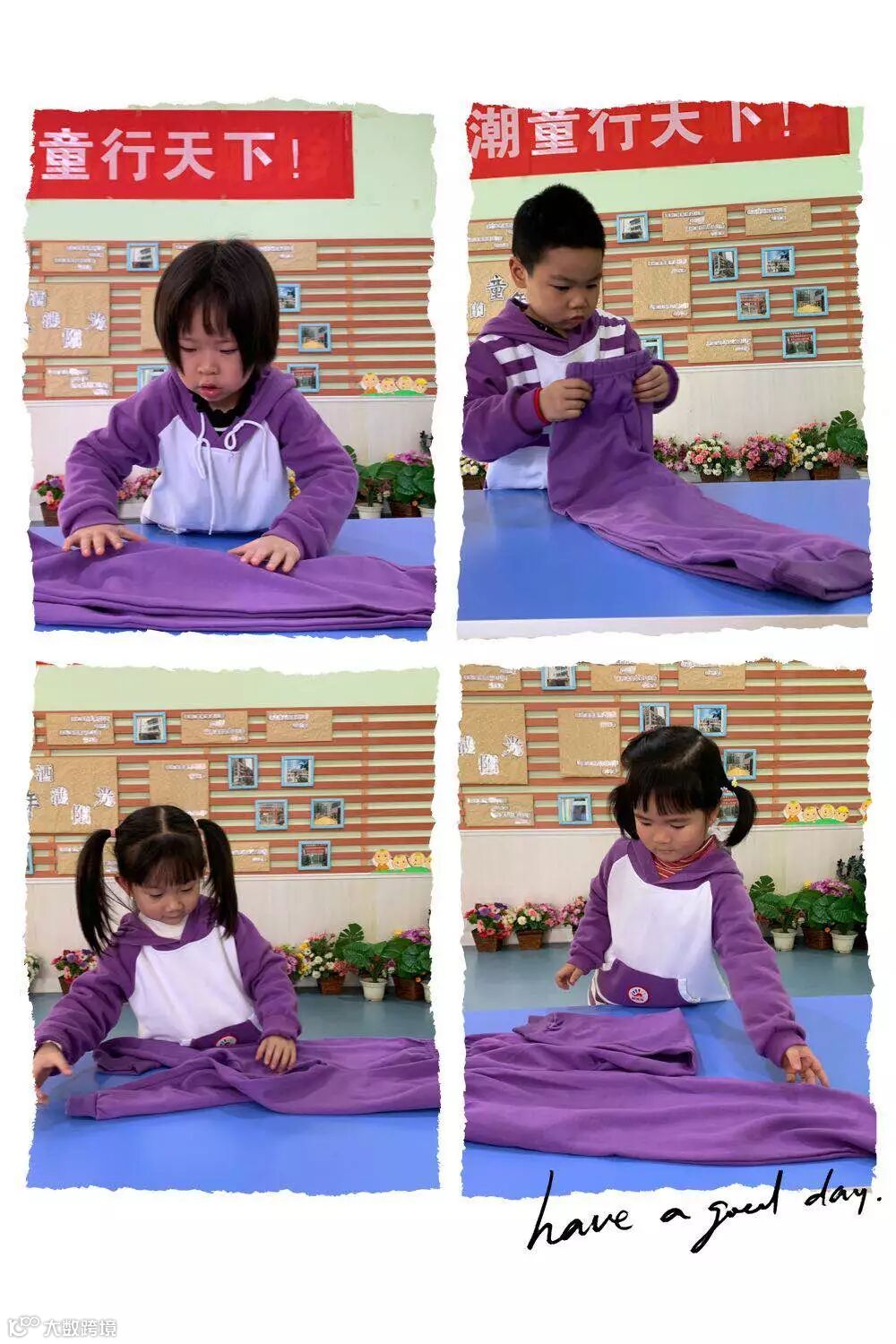 最后出场的大班组的宝贝们:叠被子。这可难不倒选手们,他们记住了叠被子的小窍门"边对边,角对角"地叠。