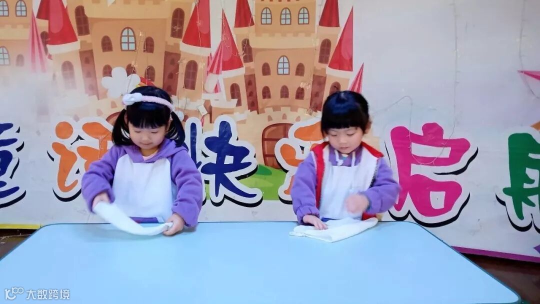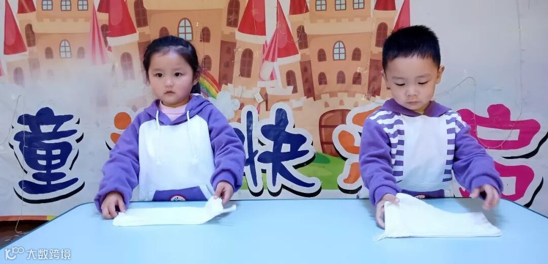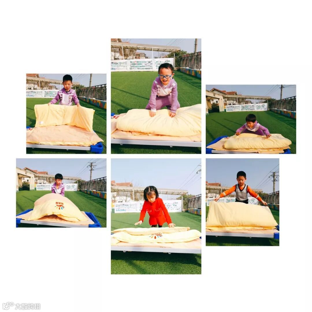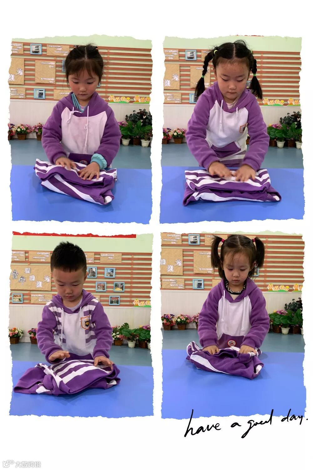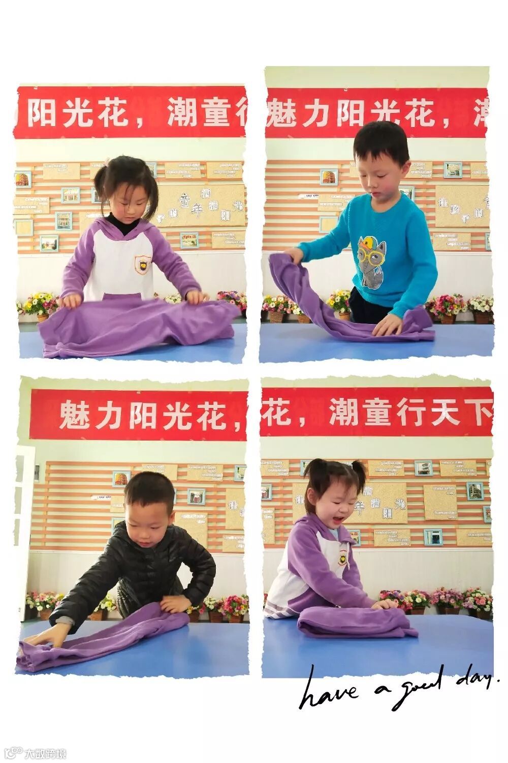 最后出场的大班组的宝贝们:叠被子。这可难不倒选手们,他们记住了叠被子的小窍门"边对边,角对角"地叠。