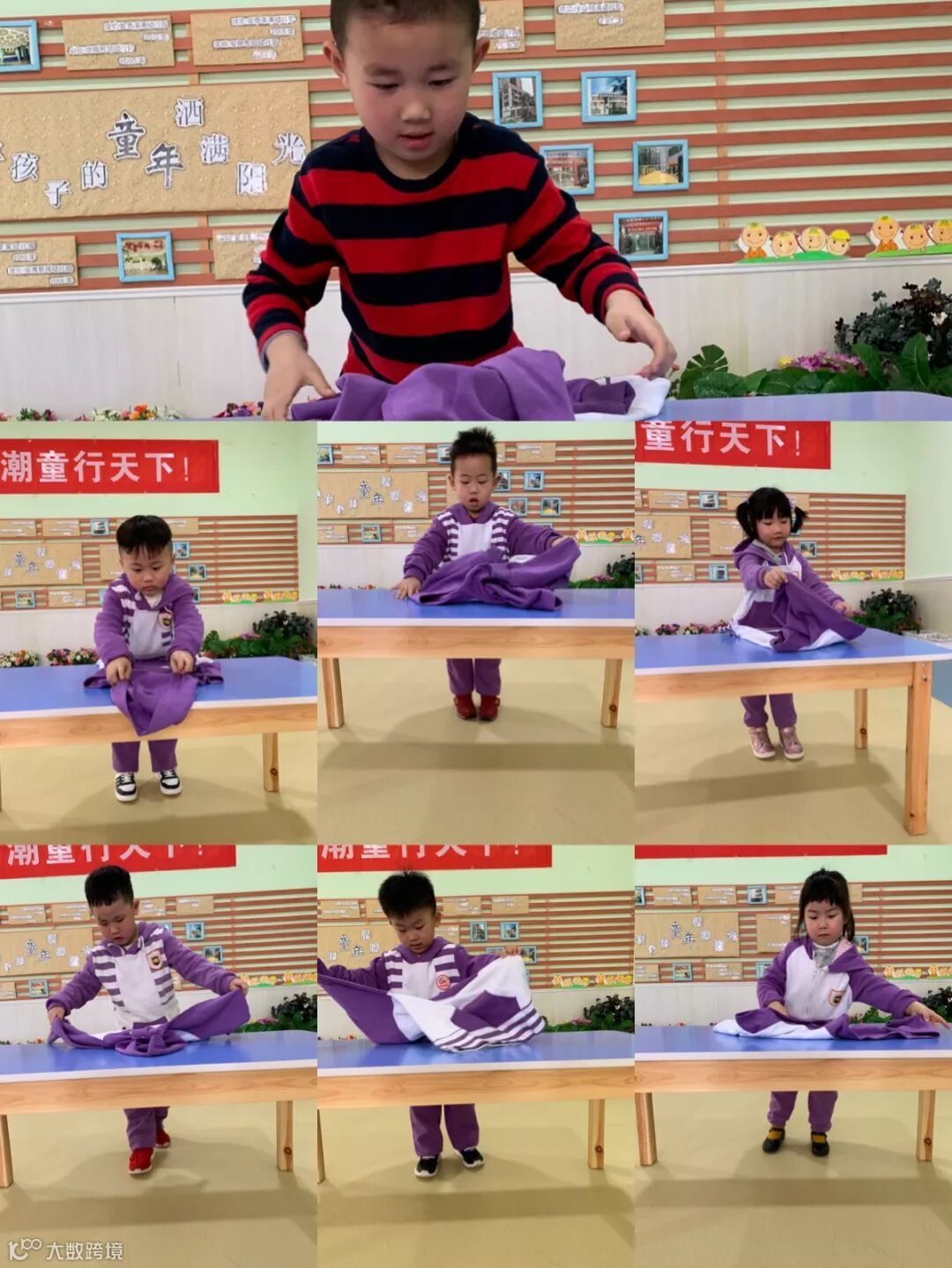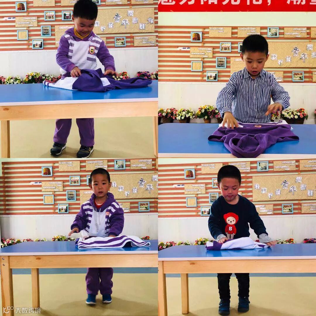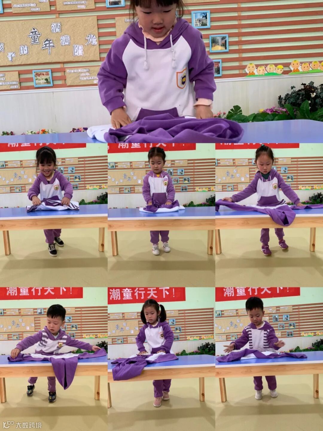 接下来是中班的小朋友出场了,随着主持人一声“预备——开始”的口令,孩子们迅速地行动起来了!中班组的宝贝们舞动着灵巧的双手,都以娴熟的动作展示出自我服务的能力,衣服一下子就叠好啦!