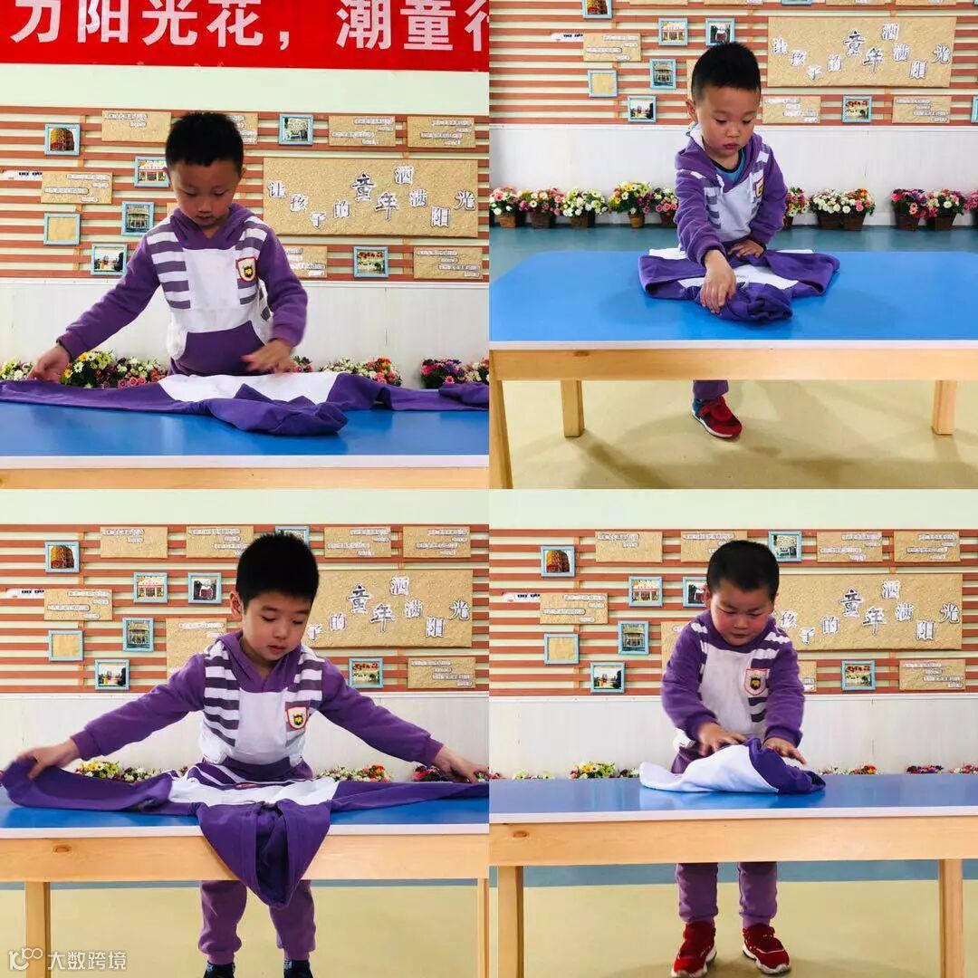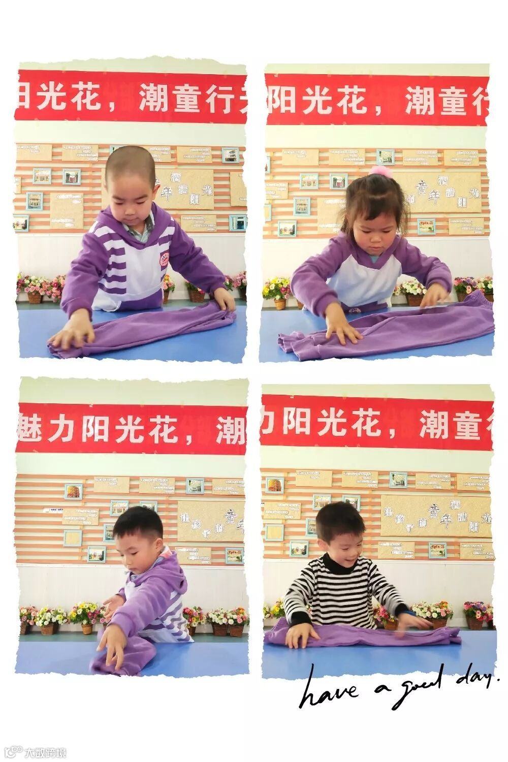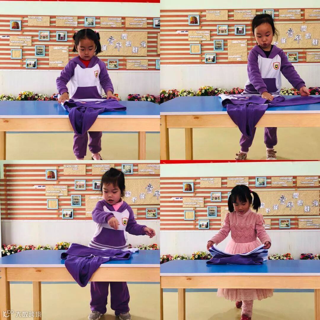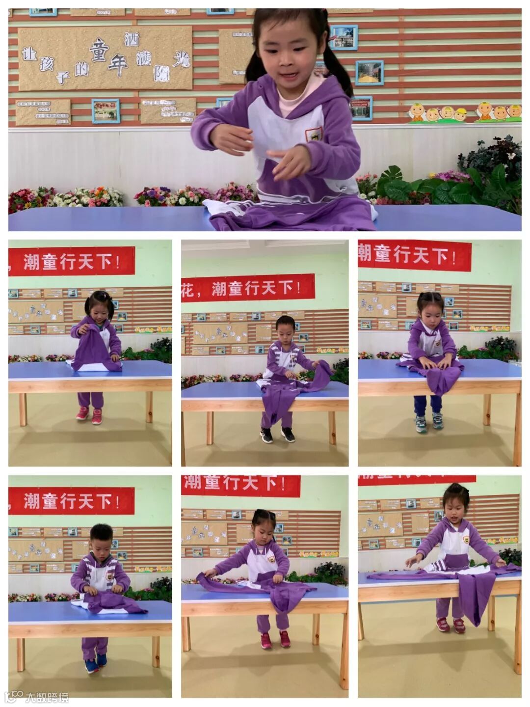 接下来是中班的小朋友出场了,随着主持人一声“预备——开始”的口令,孩子们迅速地行动起来了!中班组的宝贝们舞动着灵巧的双手,都以娴熟的动作展示出自我服务的能力,衣服一下子就叠好啦!