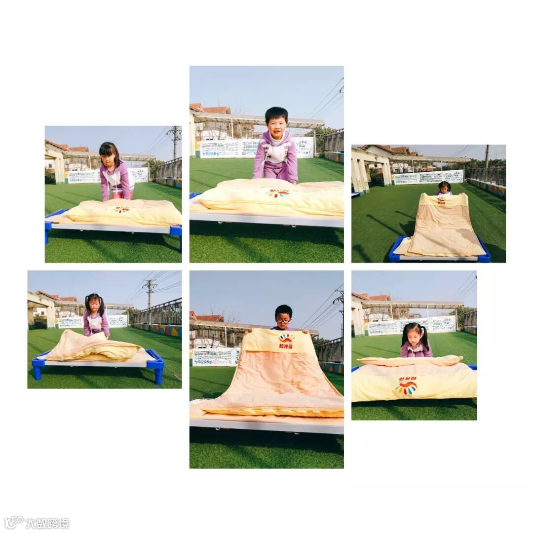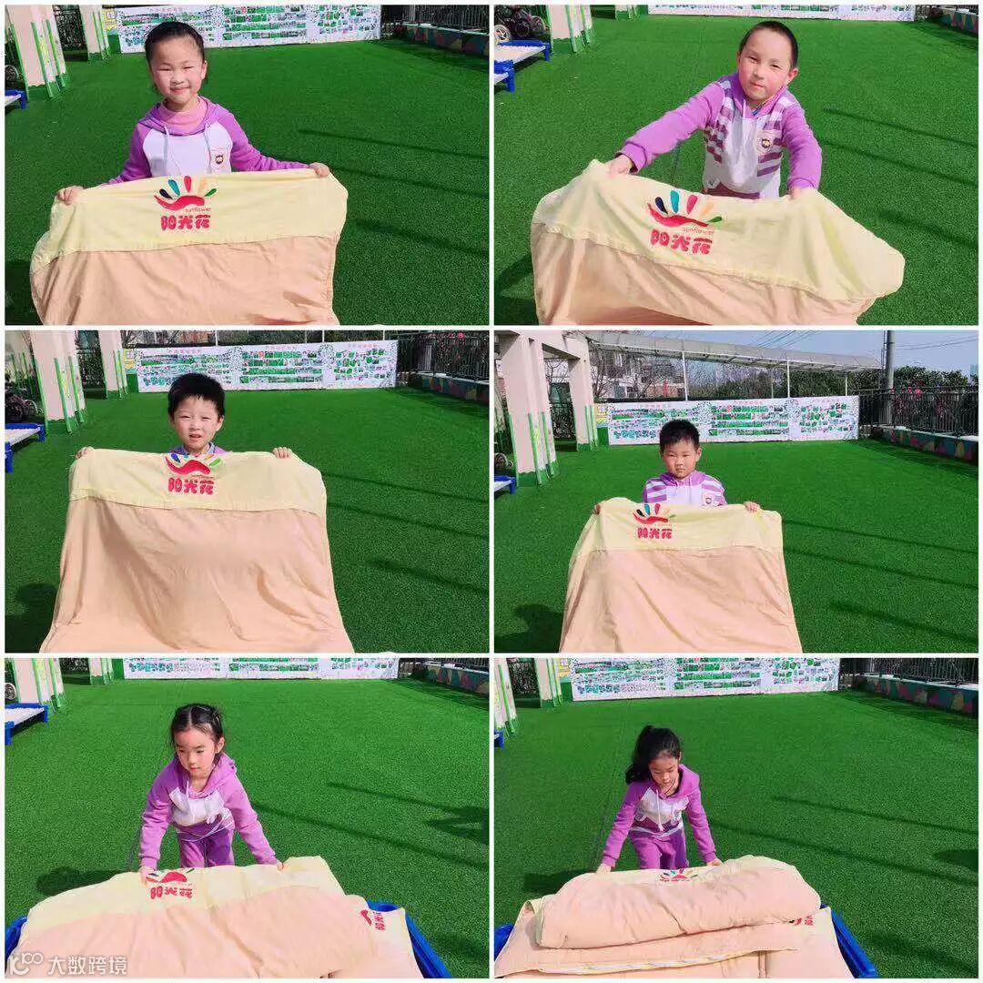 使劲铺开了自己的小被子,铺开、对折、再对折,最后再把被角拉拉整齐真的是有模有样,个个表现得身手不凡,小手灵活迅速。瞧!他们多能干!