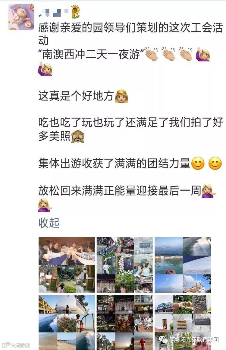 此次活动丰富了老师的业余生活,增长了老师们对古城文化及中国非物质文化的了解和见识,让老师们多方面提升自己除了业务能力以外的深度和广度。我们将会以更饱满的状态,投入到工作中。感谢阳光花教育集团董事会的大力支持!阳光花开,幸福满怀!