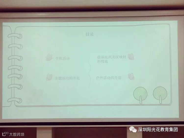 莲花二村学习分享内容有四点:1.早操活动 2.晨谈组织及区域材料投放 3.主题活动的开展 4.户外活动的开展