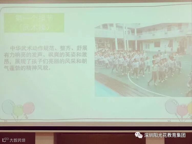 早操内容包括:入场 武术操 太极操 体能操,在进行早操时非常有序进行的,一环扣一环,队形也不是一成不变,幼儿能根据音乐及老师的手势有序的进行队形的调换。每个幼儿在早操活动中既能达到该年龄体能运动,幼儿也能在轻松快乐的活动中进行。
