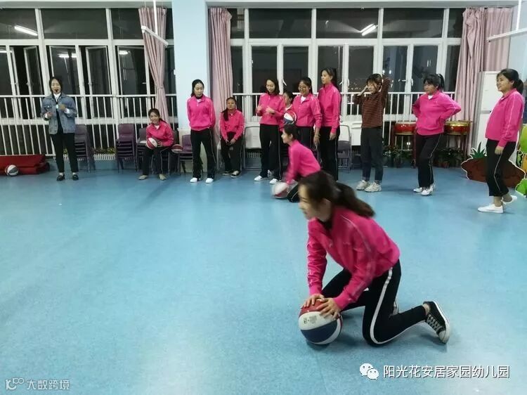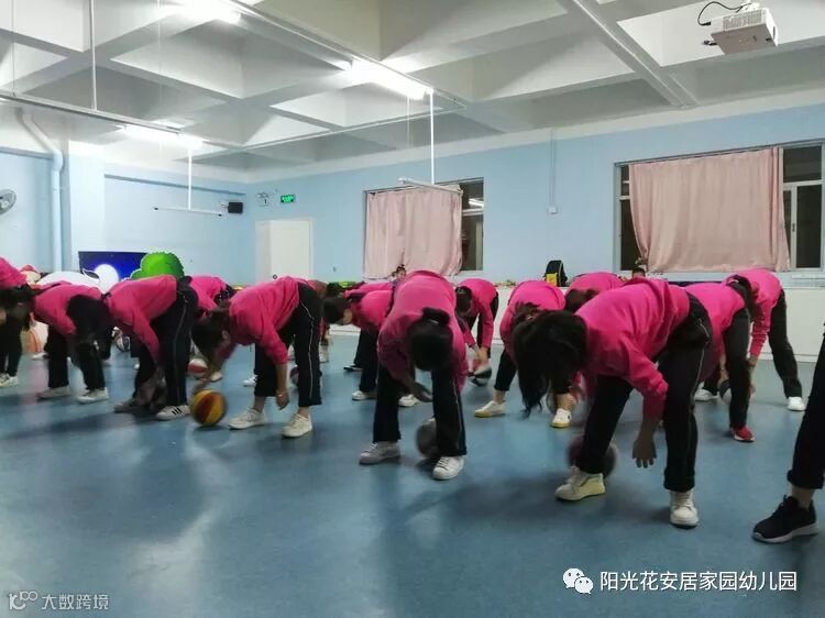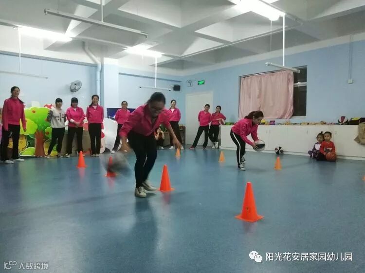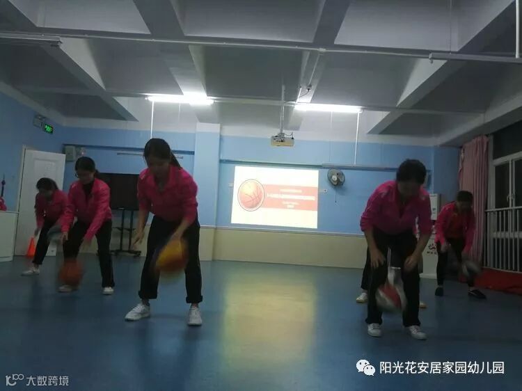 首先,针对各年龄段幼儿篮球基本目标的掌握,詹老师对老师们发起了挑战,老师们听口令做相应技能动作,要求动作规范。