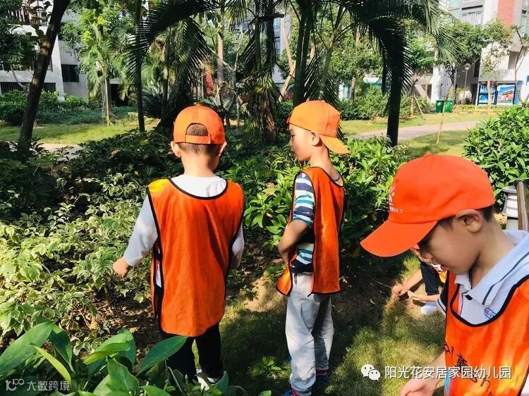 潮宝们到达小区内,在小区内展开了一场“秋天寻宝”活动。潮宝们努力寻找自己认为最好看,最特别的落叶、花朵。