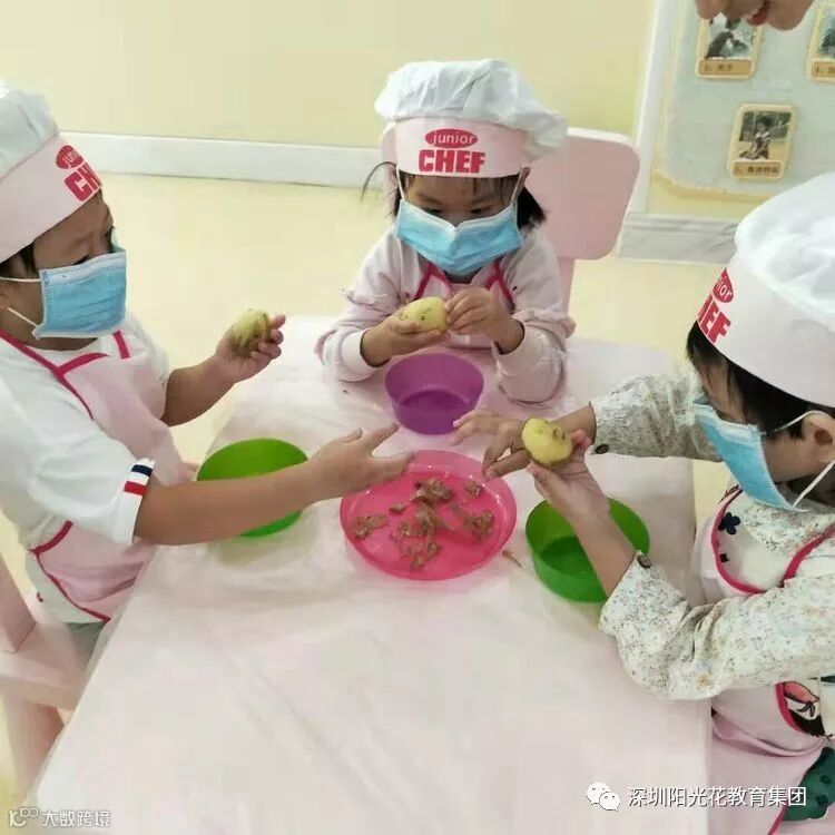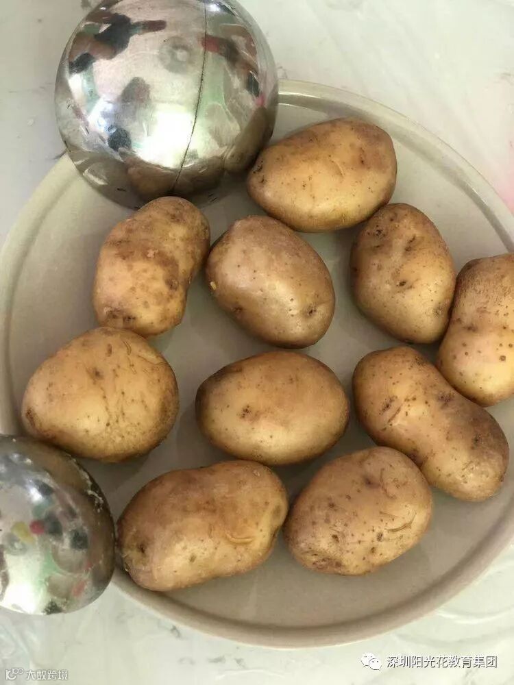 将事先蒸熟的土豆发给小朋友,小朋友徒手去皮,然后用小勺子将土豆按成土豆泥。