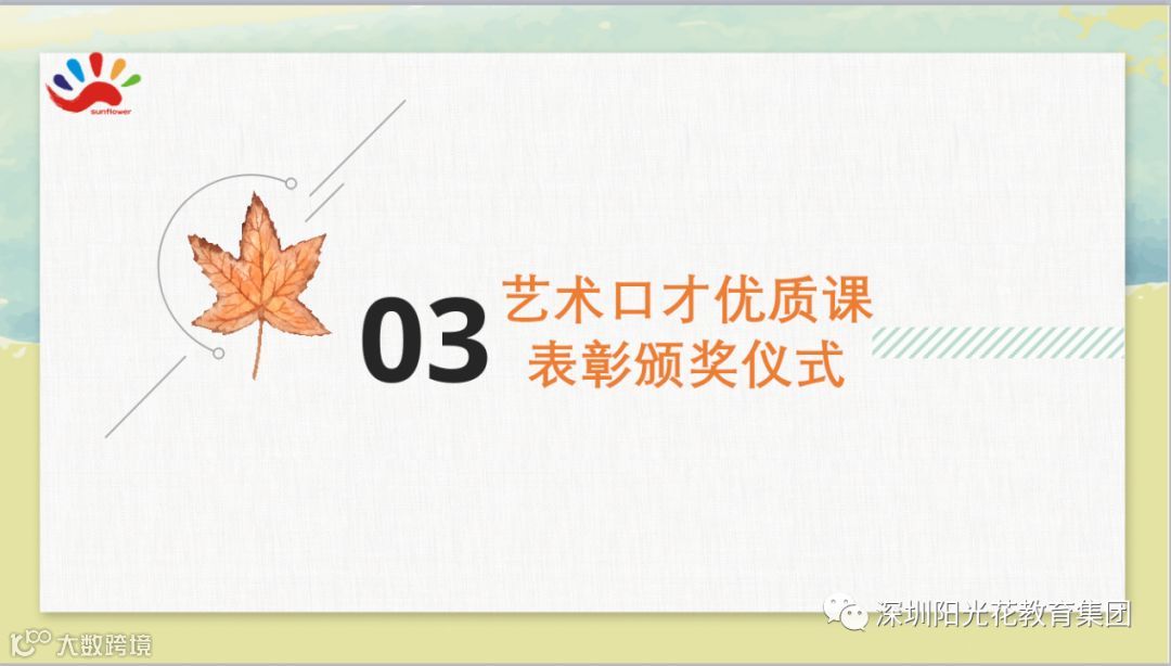 阳光花儿童艺术口才课程是阳光花教育集团的特色课程,拳头产品,一堂好课,是需要经过不断的打磨,不断的研课,才会迸发出经典。经过老师们的精心准备,在激烈的片区角逐,以及集团总决赛后,激动人心的时刻终于到来了。下面是我们的荣誉时刻。