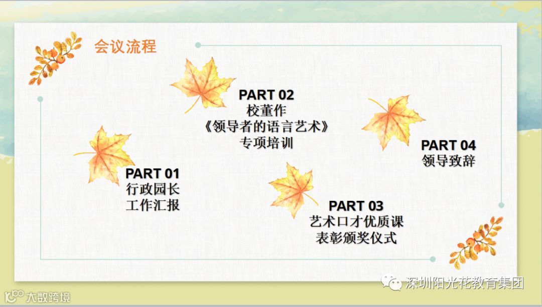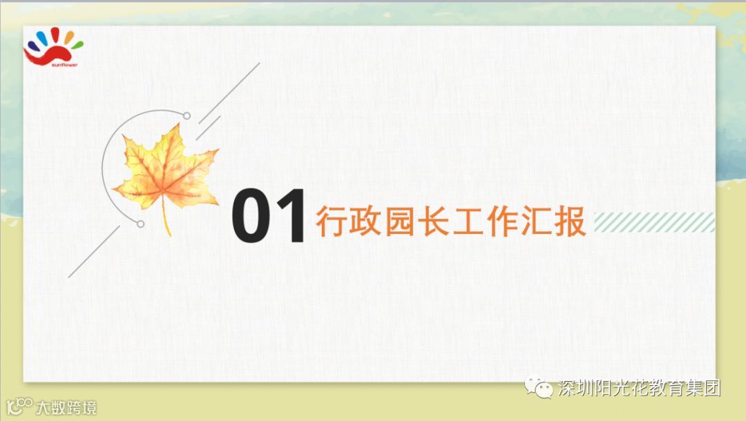 会议由深圳阳光花教育集团深圳总部林丽清总园长主持。出席本次会议的领导有:深圳阳光花教育集团校董王英女士,深圳阳光花教育集团深圳总部叶华总监,深圳阳光花教育集团深圳总部教科研部王赟部长,深圳阳光花教育集团深圳总部行政部梁丽莎主任,深圳阳光花教育集团深圳总部行政部鞠艳园长,深圳阳光花教育集团教科研部李建惠主任。