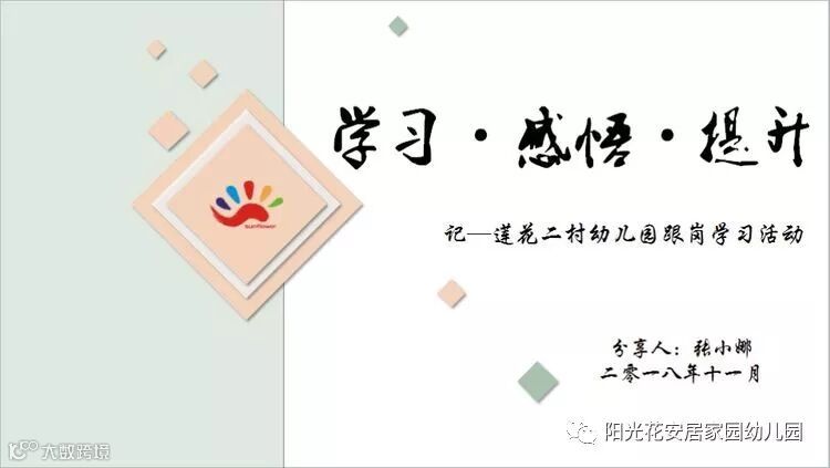 最后张园长通过“学习·感悟·提升”三个方面也给我们分享了“莲花二幼的跟岗学习”!