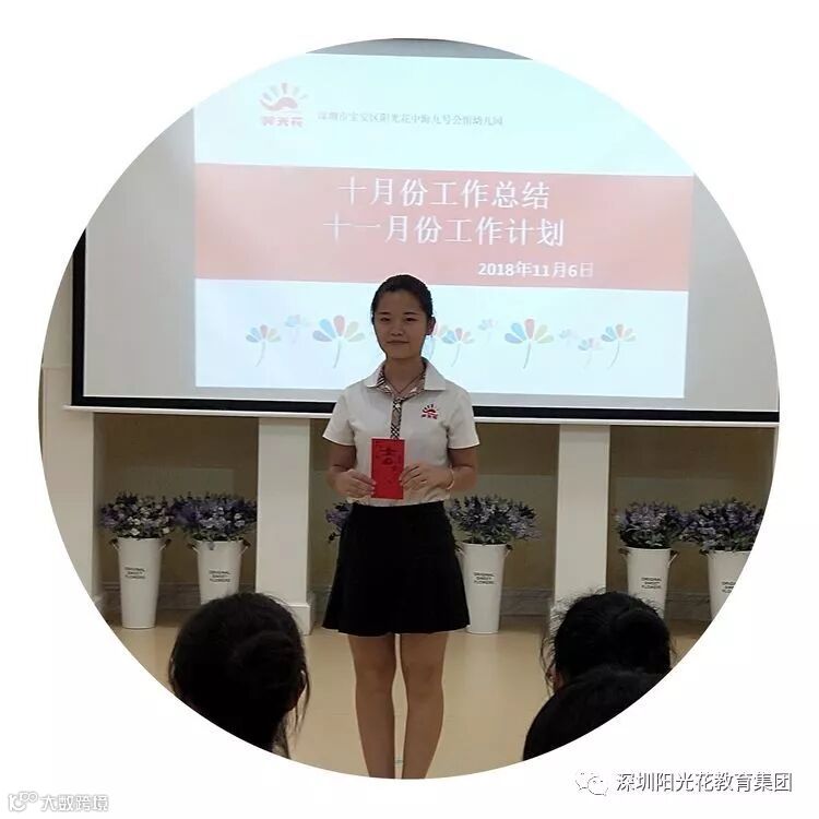 随后会议第二项,分别表彰了十月份优秀员工和优秀班级。陈园长为优秀个人和班级分别颁发奖金激励全体员工向她们学习,希望十一月份能涌现出更多的新秀员工。