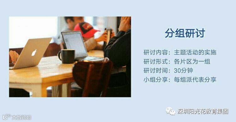 主题活动是阳光花素养课程实施的重要途径之一。针对11月份“爱上阅读”主题活动的实施,参会的园长分为三个小组,分别针对小中、大各年龄段主题活动的实施进行了研讨。在研讨过程当中,各园分享了各自在实施过程中的经验,并针对在实施过程中所遇到的困惑和疑问进行了讨论。