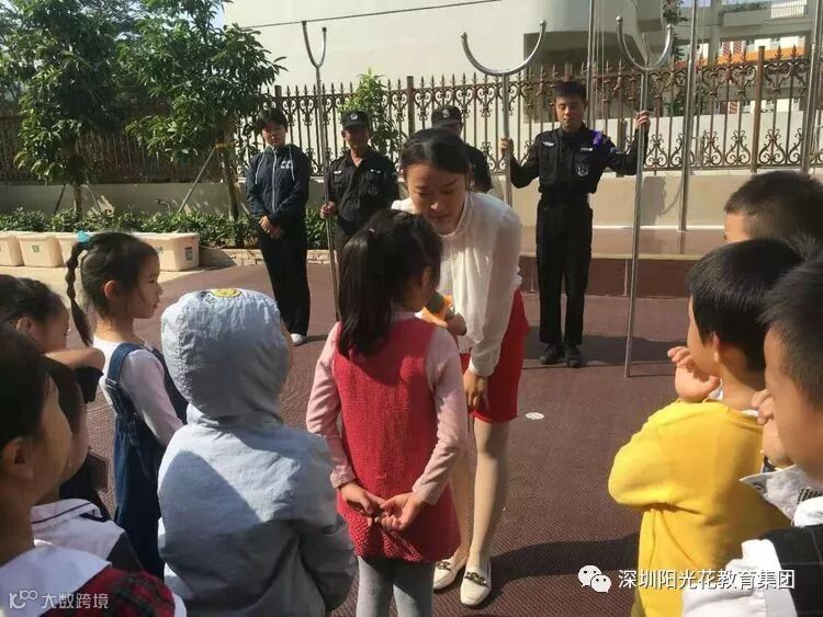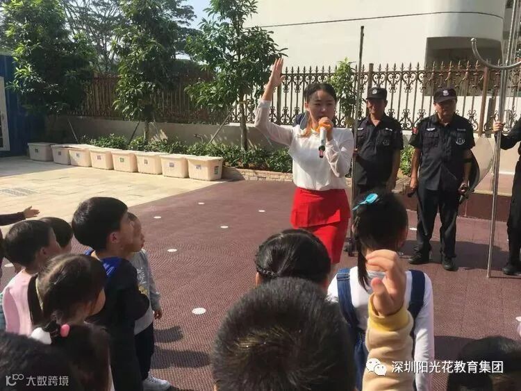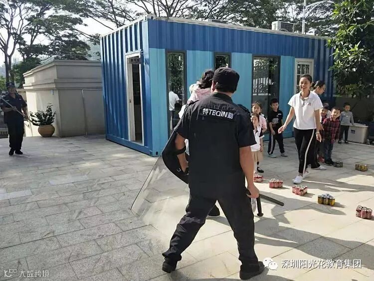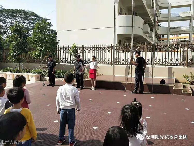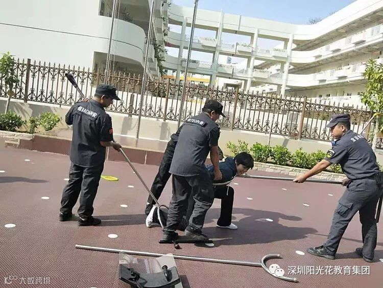 演练结束后,老师们组织小朋友集中到操场,请幼儿将刚才所看到的一幕说出来并说出自己逃离现场的方法。 随后,邀请校卫队小余叔叔向小朋友介绍校卫防御工具及告诉幼儿遇到这种情况最好的保护自己的方法,并在全体幼儿面前演示了一遍校卫队擒拿坏人的方法,小朋友即刻对保安叔叔们最热烈的掌声,感谢保安叔叔们每天在园保护自己的安全。
